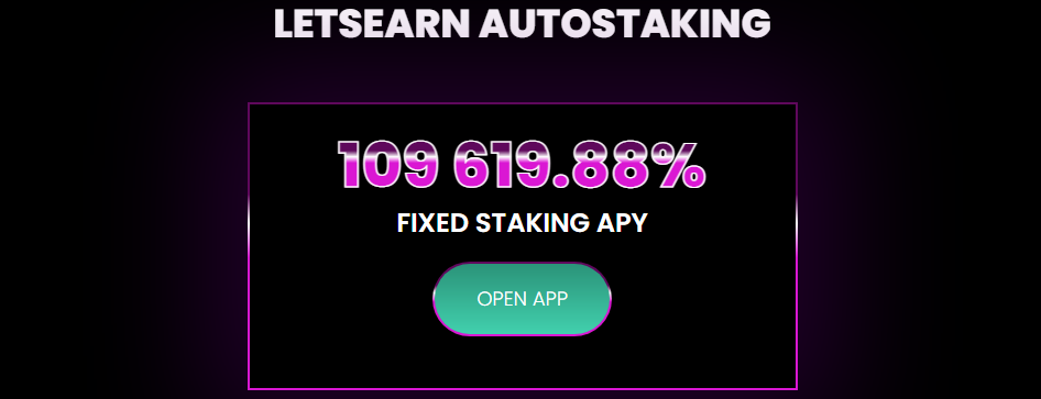 The $LETSEARN coin has automatic staking and compounding functionality thanks to the Let's Earn Protocol. In the cryptocurrency world, the Let's Earn Protocol is designed to be long-term sustainable while maintaining the highest APY in the industry, which is 109,619.88%.