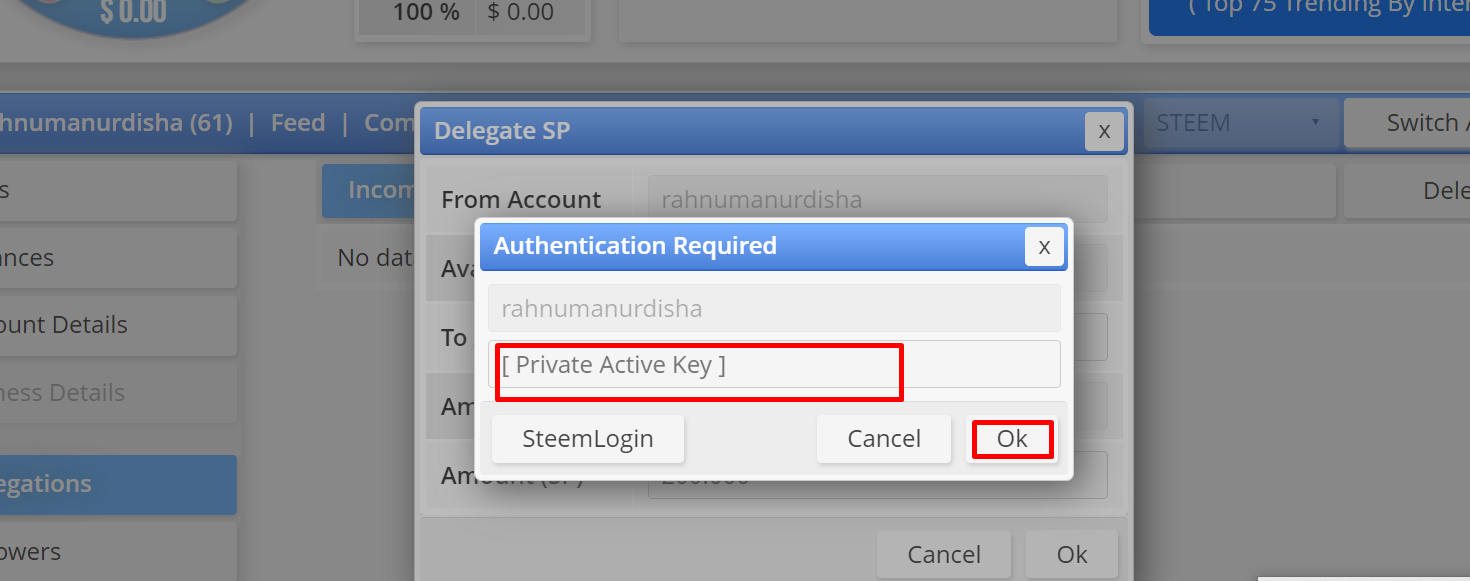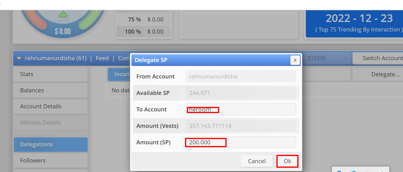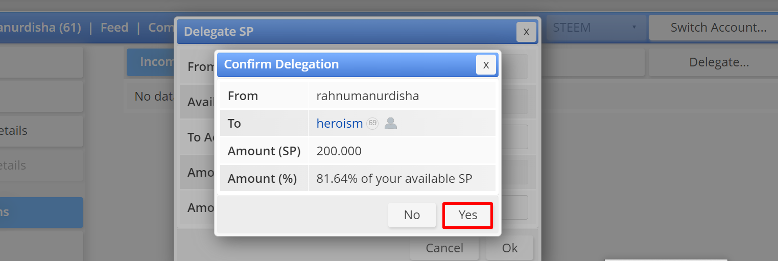 এবার যে ড্যাশবোর্ড টি এসেছে সেখানে টু একাউন্ট এ @heroism বসাবো তারপর এমাউন্ট এসপি তে পরিমাণ বসাবো কতো এসপি ডেলিগেশন করতে চাই।তারপর অকে অপশনে ক্লিক করবো।