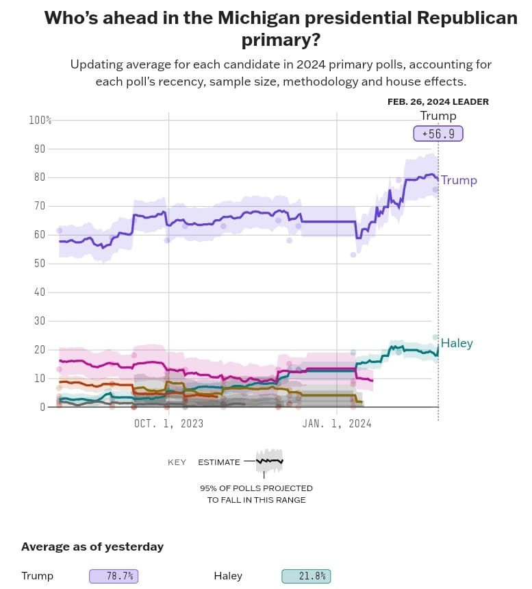 Michigan's primary is today for both parties. The month ahead is going to be a thrashing for Haley. She's down by 40-70 points in the upcoming primaries.