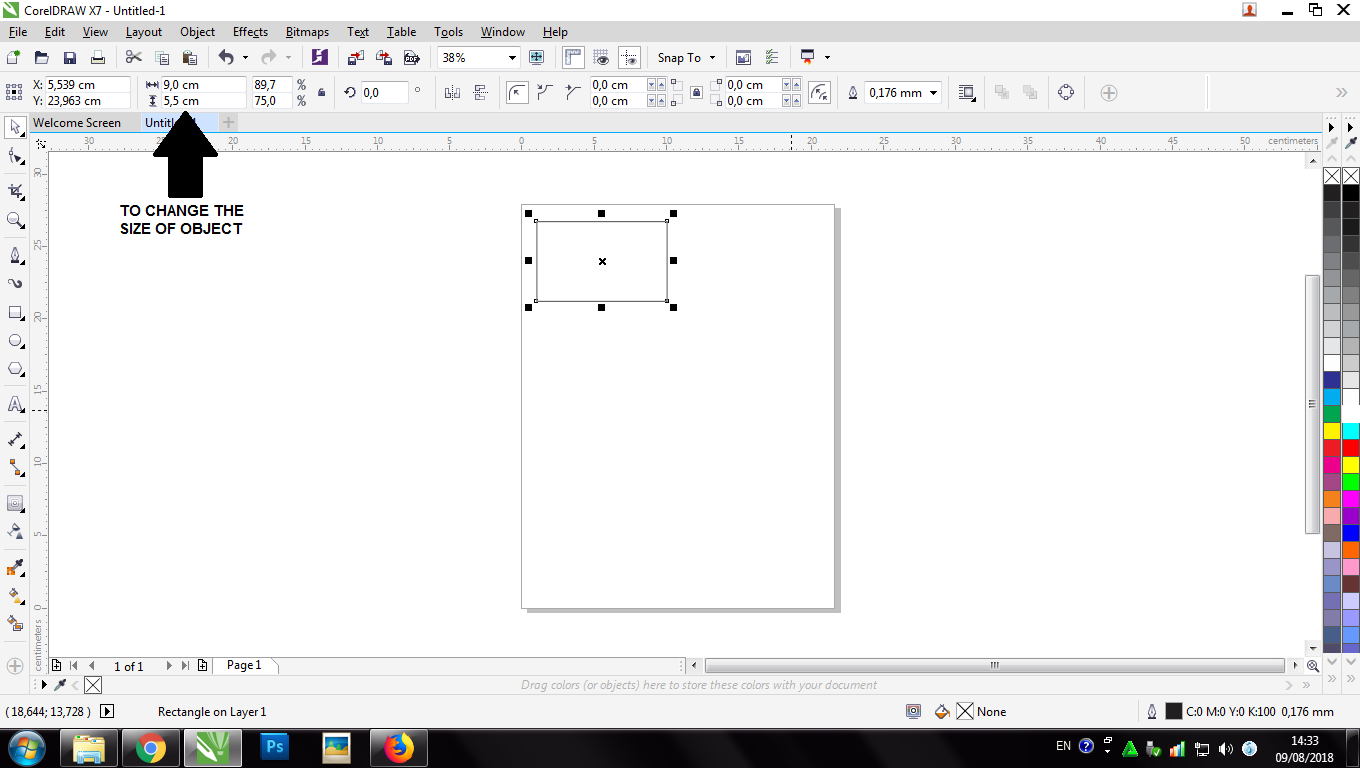 then reactivate the object you want to change and change its size to length 9 cm and width 5.5 cm. (standar size)