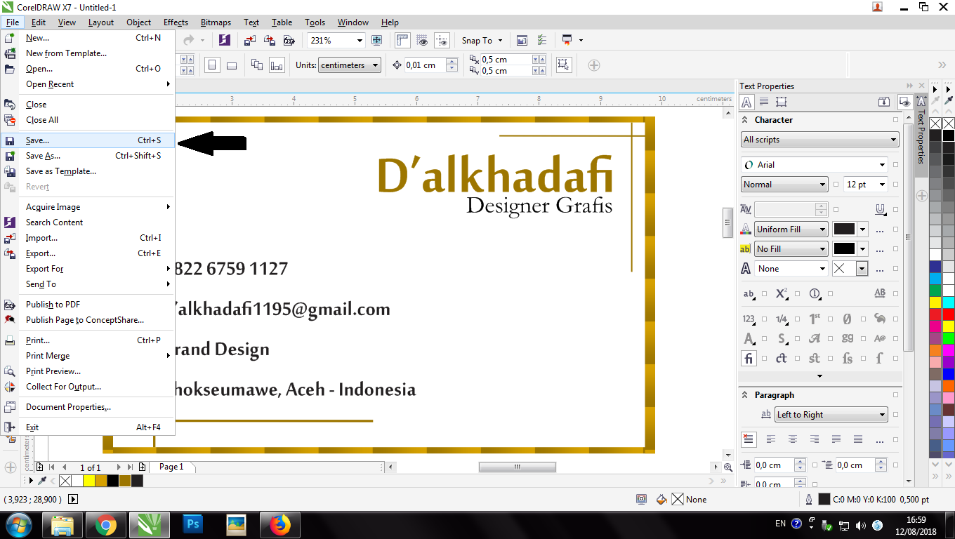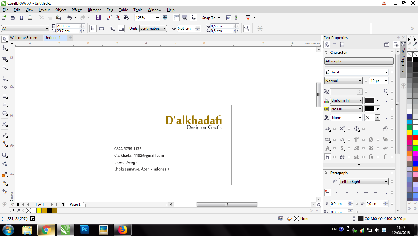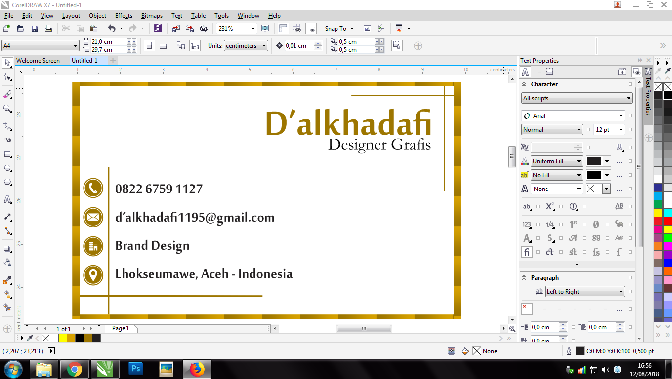 A Name Card is a card that conveys information about a company or individual that is submitted only as a reminder in a formal introduction. In general, business cards contain company names (including company logos) and postal addresses, telephone numbers, fax and e-mail numbers, websites. Traditionally, many business cards that use black text with a white background, but now many business cards use and apply striking aspects of visual design. Business cards are a must for a professional, and this time we will make a simple business card using the "COREL DRAW" application.