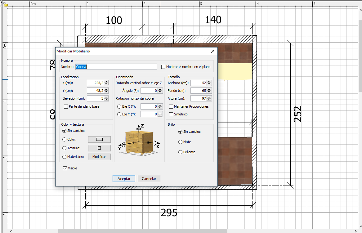 Volviendo al caso inicial (la cocina), pues se tomaron las medidas del área en cuestión, la escala utilizada fueron los centímetros. Largo y ancho del área, tamaño de la estufa, nevera y fregadero, así como las medidas estimadas de lo que se quería realizar. Sweet Home 3D. te permite modificar el tamaño de cada uno de los objetos que allí se visualizan, desde paredes hasta una simple taza decorativa.