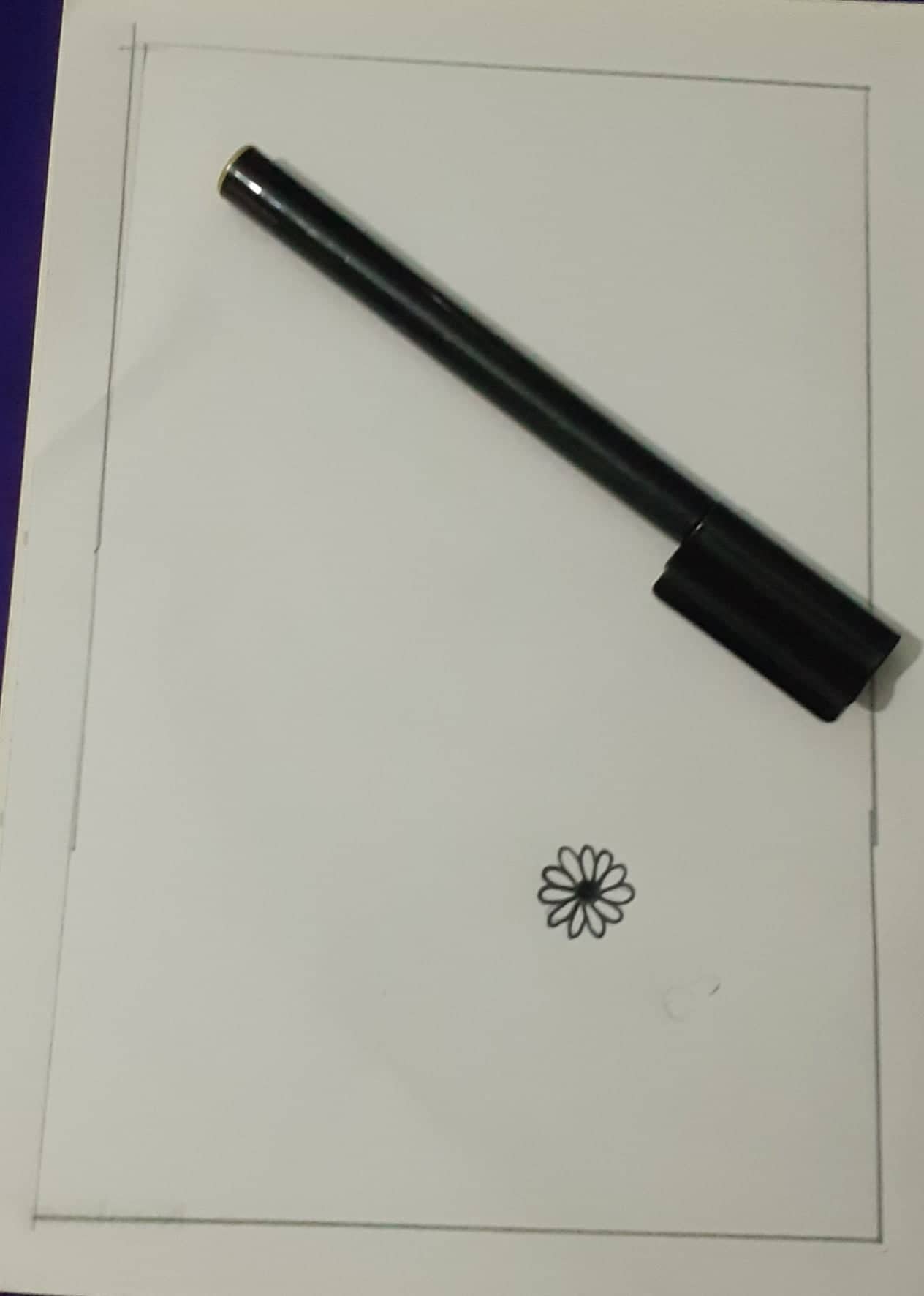 প্রথমে সদা কাগজের চারদিকে দাগ একে নিতে হবে। এরপর ছোট একটা ফুল একে নিতে হবে। নিচের ছবিতে যেভাবে আকা হয়েছে।