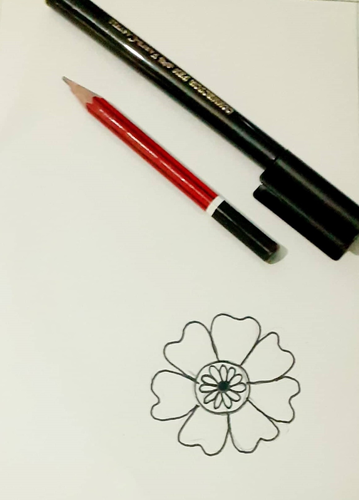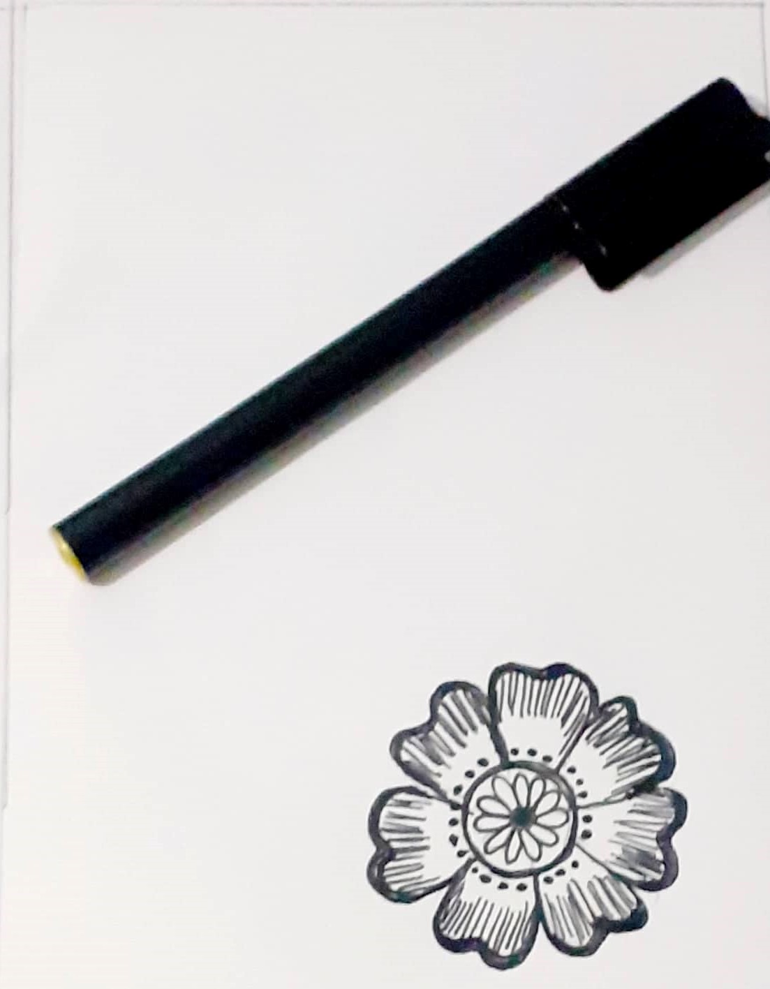 এ ধাপে আকা ফুলটিকে সাইন পেন দিয়ে ডিপ করে একে নিতে হবে। নিচের ছবির মত করে।