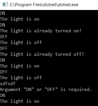 Console.WriteLine("Argument \"ON\" or \"OFF\" is required.");