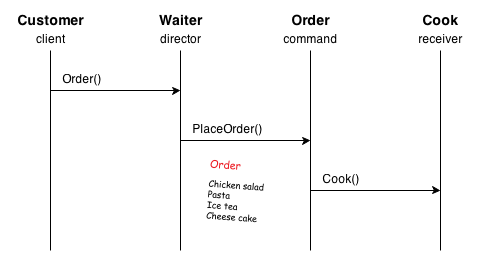 Suppose we have to make a system that records all the activities of ordering food from the order by the customer to the order to the cook and we want to be able to see the orders that are in the queue, it is good to use the command pattern in this example. To illustrate the situation is the picture below 🙂