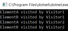 As you can see the ElementB and ElementA classes do not differ much, just the name of the class, we will pass the name of the class as an argument to the VisitElement() method, thanks to which the compiler will know which version of the VisitElement() method must to invoke.