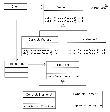 The implementation in short looks like, the Visitor class declares the visit() method, whose argument is an element of the structure and elements of the structure declare the accept() method, which accepts as argument the Visitor class, the accept() method calls the visit() method in the Visitor class depending on the type of argument passed.