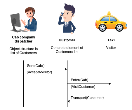 Let's now make an example on the principle of a transport company, the structure class of objects is a list of clients, the customer is one of the elements of this list, and the taxi is an example of the Visitor class. As they say, the picture means more than a thousand words :)
