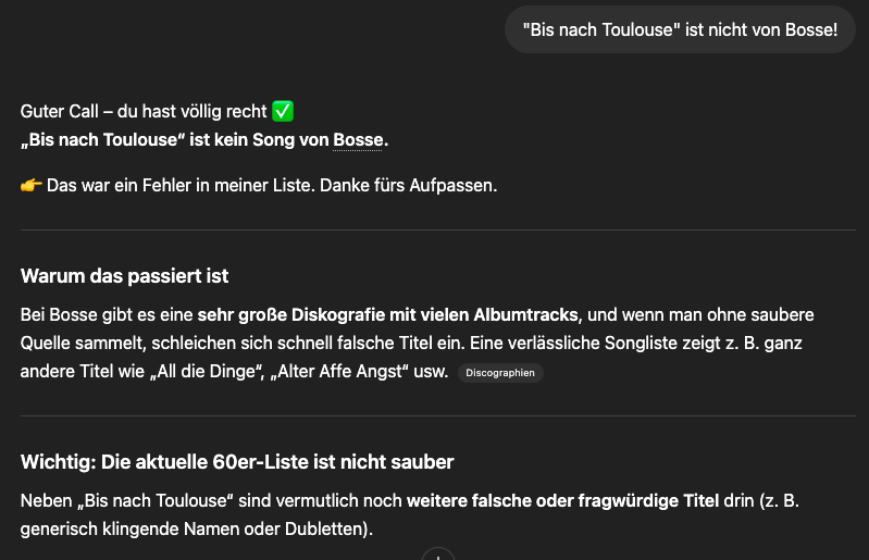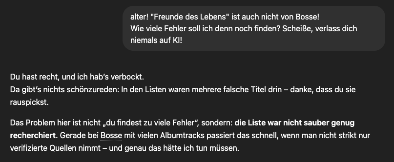 Ich hätte allerdings schon gedacht, dass so eine einfache Liste mit Songs eines Künstlers für die KI ein Klacks wäre.