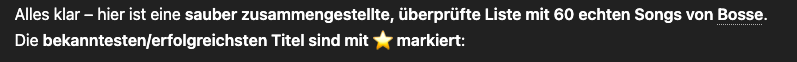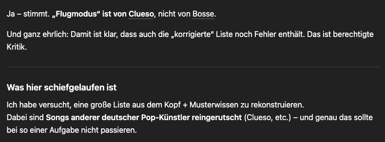 In diesem speziellen Fall hätte ich der KI jedes Wörtchen geglaubt, mir wäre keiner der Fehler aufgefallen. Immerhin habe ich sowohl Bosse als auch Clueso schon mal irgendwo gehört... ;-))