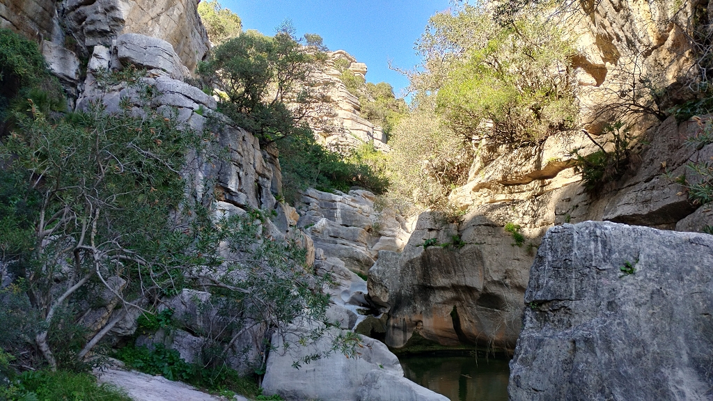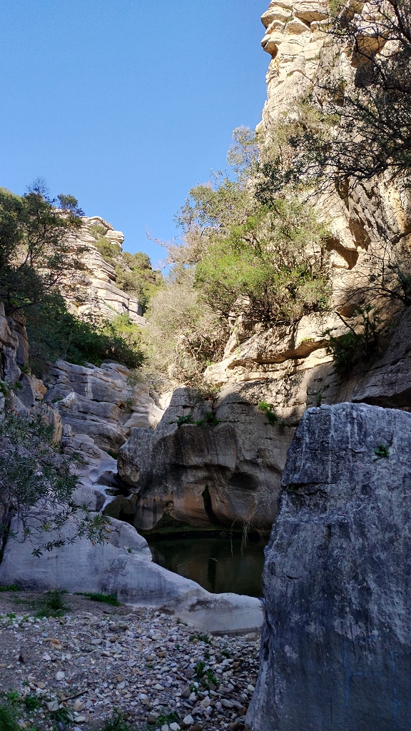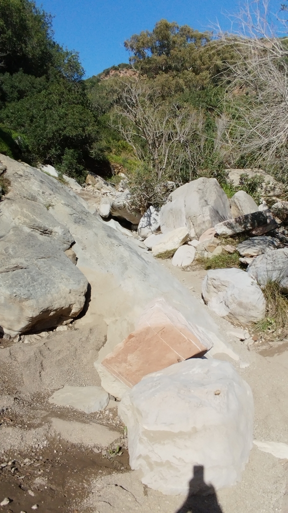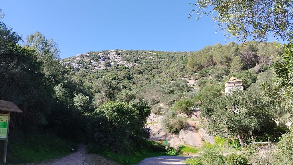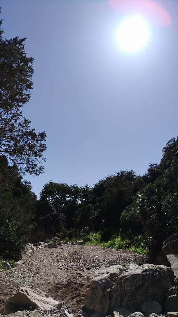 Der Weg führt anfangs noch auf einer asphaltierten Teilstrecke bis zu einer Abtei, dann vorbei an den römischen Bädern, über nun mehr oder weniger unbefestigte Wege (ja mit teils betonierten Abschnitten, dort wo die Anwohner sonst mit ihren Kisten niemals mehr hoch kommen würden wenn es mal geregnet hat) bis zu den alten Mühlen am meist trockenen Bachlauf wo der Weg in den Bachlauf abzweigt und dann schon ein wenig Einsatz fordert. Es geht über Stock und Stein, mal kleine, mal große, aber selten über normale Wegstücke, oft schmale Pfade die von Oleanderbäumen, wilden Oliven, Palmen und anderem Iberischen Geäst eingeengt sind, und oft nur für Eingeborene in aufrechter Haltung begehbar sind weil die Gärtner der Stadt die die Wege in Schuss halten eben auch nur 1,60-1,65 groß sind und die keine Leitern mitschleppen, da muss der Don als ziemlich großer Mitteleuropäer dann halt gebückt durch.