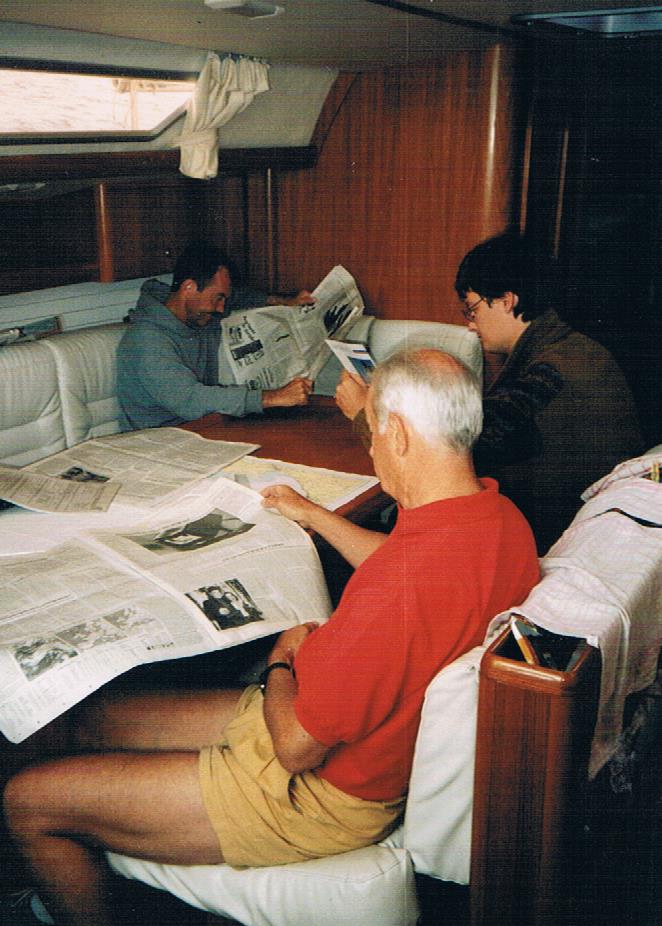Aber hallo, unter Segel oder Motor gab es für keinen auch nur einen Tropfen. Der wäre Kielgeholt worden, aber gaaaaannz langsam. Mit einer Ausnahme, ab 13 Uhr durfte Kippe, der Herr habe ihn selig, (wie auch 4 weitere Crewmitglieder), die eine oder andere Dose Bier trinken, da er aus Verletzungsgründen seemännisch nicht mittun konnte. Er war unter anderem Garant für beste Stimmung an Bord. Heinz konnte am lfd Band Witze erzählen ohne auf die Nerven zu gehen, weil so, als ob er die Situationen selbst erlebt hätte, ein Naturtalent. Außerdem war er "Motorbootfahrer auf Mallorca", beim Segeln höchstens für die Theorie zu gebrauchen.