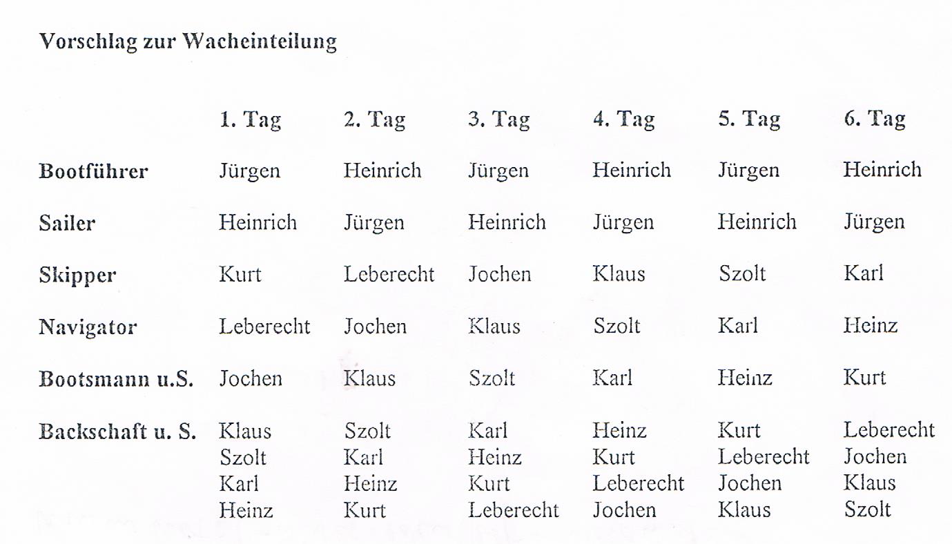 Gut ausgeschlafen und nach einem reichhaltigen Frühstück ging die Reise mit Verspätung los, wie unser Navigator im Logbuch vermerkte. Die Batterie, ein Segelschiff hat ja auch einen Motor (hier Diesel) streikte und mußte ausgetauscht werden. Auf einem Schiff muß unbedingt Ordnung herrschen, hat unser Cäpten uns sofort beigebracht. Deshalb wurden auch alle Aufgaben und Pflichten aufggeteilt, für jeden Tag im Wechsel, s. Wacheinteilng: