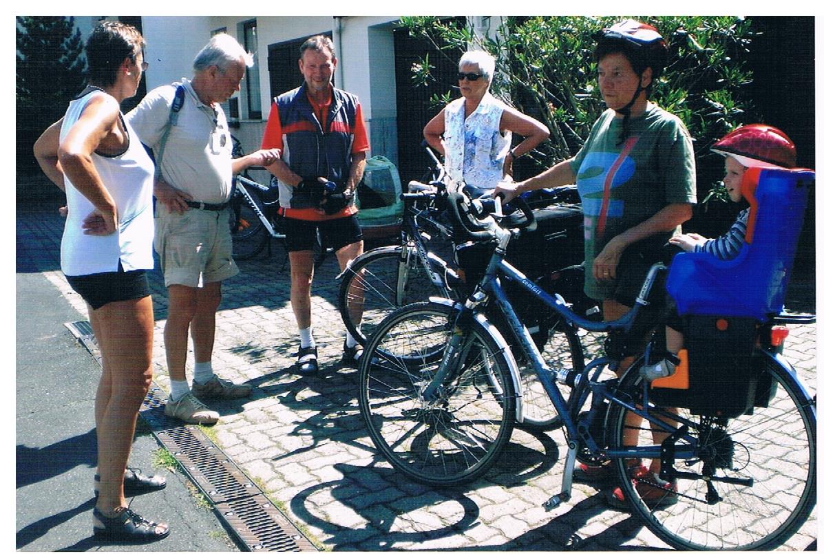 09:45 starteten wir von zu Hause, da wir mit einigen Freunden verabredet waren, hatten wir bis Homburg Begleitschutz, der dann zurück fuhr. Einige wären sicher gern mit auf die lange Reise gegangen. Nach Marktheidenfeld wechselten wir auf die rechte Mainseite, da dort in der Nähe des Radweges einige Gasthäuser waren, wo wir Mittagspause machen wollten. Es zeigte sich schon damals, daß das nicht so einfach war. Viele Wirtschaften waren um die Mittagszeit geschlossen. Erst in Neustadt, einige Ortschaften weiter als vorgesehen, hatte ein Gasthaus in armenischer Bewirtschaftung, eine andere Einstellung zu Öffnungszeiten. In der gemütlichen Biergartenatmosphäre hielten wir es locker 45 Min. aus, denn wir merkten, dass wir Gemünden sonst am frühen Nachmittag erreicht hätten. In Erlach gingen wir über die Fußgängermainbrücke und radelten in schönstem Sonnenschein unserem Etappenziel entgegen. Wir waren fast immer allein auf dem Radweg, konnten also locker nebeneinander fahren, bis ein supergroßes A..., männlich, auf einem Mountainbike, uns rechts überholte, natürlich ohne vorher geklingelt zu haben. Hätte meine Frau aus irgendeinem Grund einen kleinen Rechtsschlenker gemacht, wäre es unweigerlich zu einer Karambolage gekommen, mit ungewissem Ausgang. Wir haben ihm noch ein paar schöne Dinge nachgerufen, weil wir stocksauer waren. Nach ein paar Minuten kam das weibliche Pendant, natürlich auch ohne zu klingeln, drängte sie sich unnötiger weise an uns vorbei. Auf den Zuruf: Klingeln, gab es zur Antwort ein dämliches - hab keine. Das konnte nur seine Frau gewesen sein. Auf der ganzen Tour war das die einzige Situation, wo man sich richtig aufregen musste, weil solche Aktionen so gefährlich sind und dazu unnötig wie ein Kropf. Zur Beruhigung machten wir ein Fußbad im Main und waren schon um 16 Uhr in Gemünden.