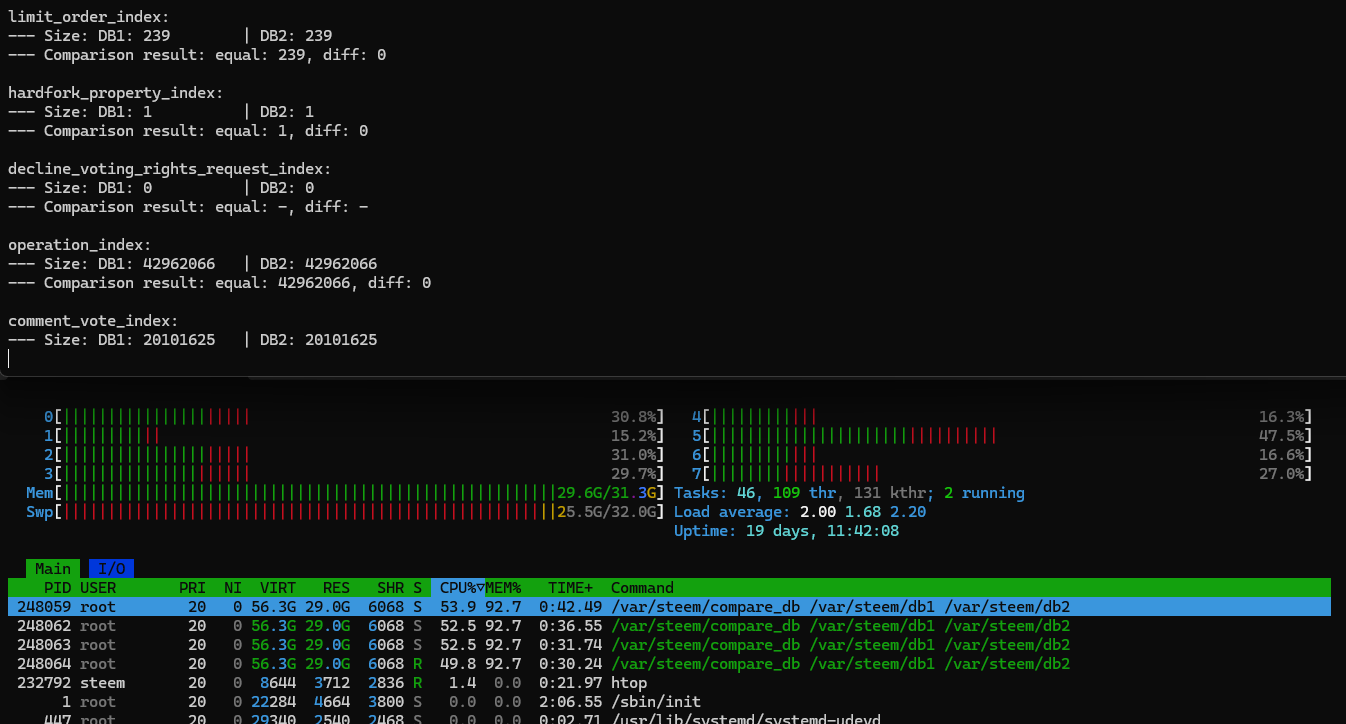Tja, irgendwann vor ein paar Tagen hatte ich dann endlich den Container mit dem Vergleichs-Tool gestartet, und dieser hat ohne zu murren die Datenbanken-Einträge der beiden steemd-Versionen verglichen... Mit Erfolg (hier ein Auszug aus dem log):
