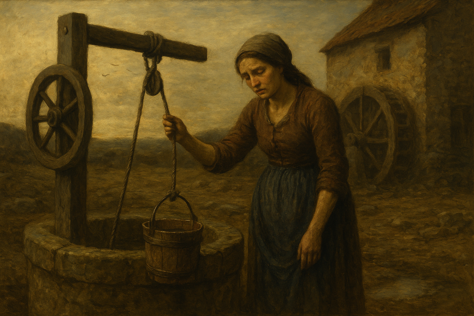 Ich habe keine Kraft mehr, den Eimer hochzuziehen. Mir tun die Hände weh. Warum kann nicht einer der Burschen das Wasser holen? Die sind es ja, die mir keine Handschuhe beschaffen. Und sie bauen auch keinen Flaschenzug, obwohl ich ihnen das schon hundert Mal gesagt habe. Es kann doch nicht so schwer sein! Aber sie kümmern sich ja um gar nichts. Ich mag mich kaum noch umschauen - der Verputz der Stallwand bröckelt, es liegen große Steine im Hof, eine Pfütze in einer Kuhle, rundherum nur erdiger Boden - dabei könnte dort grün sein, mit sauberen Platten zum Gehen. Aber nein, nichts dergleichen. Auch das Mühlrad steht still, seit es keiner mehr pflegt, wozu auch, der Müller ist weg.