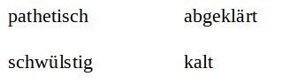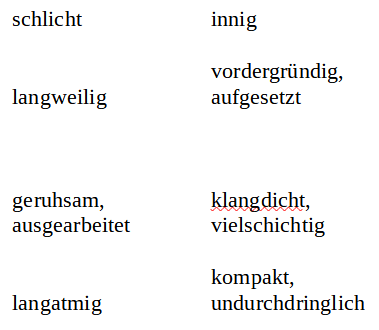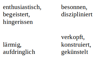 Das direkte Gegenteil von "lärmig, aufdringlich" wäre etwa "besonnen, diszipliniert", aber davon ist "lärmig, aufdringlich" natürlich nicht die Übertreibung. Es ist eher die Übertreibung von so etwas wie "enthusiastisch, begeistert, hingerissen". Dessen Gegenteil und gleichzeitig die Übertreibung von "besonnen, diszipliniert" sehe ich in "verkopft, konstruiert, gekünstelt". Ich hätte damit folgendes Quadrat erhalten, und es kommt jetzt nicht sehr darauf an, wie treffend oder verbesserungswürdig die von mir genannten Eigenschaftswörter sind, sondern was ich mit dem Quadrat werde anfangen können, was ich für mich persönlich aus der Konstellation seiner vier Ecken lernen will: