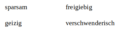Geizig wirkt, wer übertrieben sparsam auftritt, und übertriebene Freigebigkeit wird oder wirkt verschwenderisch. Halten sich Sparsamkeit und Freigebigkeit die Balance, kommt es nicht zu den Übertreibungen. Die „klassischen“ Gegenteile finden sich auf den diagonal einander gegenüber liegenden Ecken.