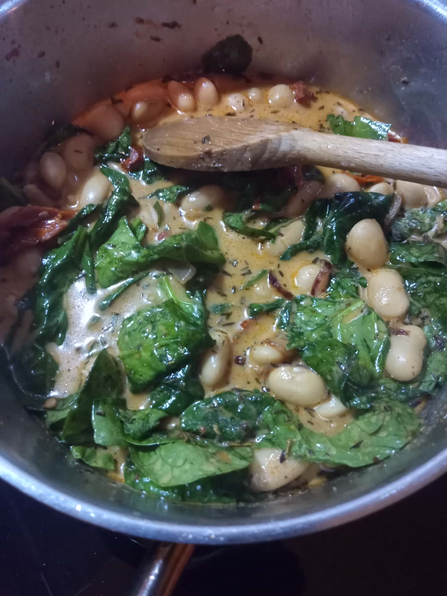 In den Sud werden die kleingeschnittenen getrockneten Tomaten, die Riesenbohnen und der Spinat hineingegeben. Dazu kommt der geriebene Käse. Alles zusammen köchelt jetzt noch etwa 5-7 Minuten.