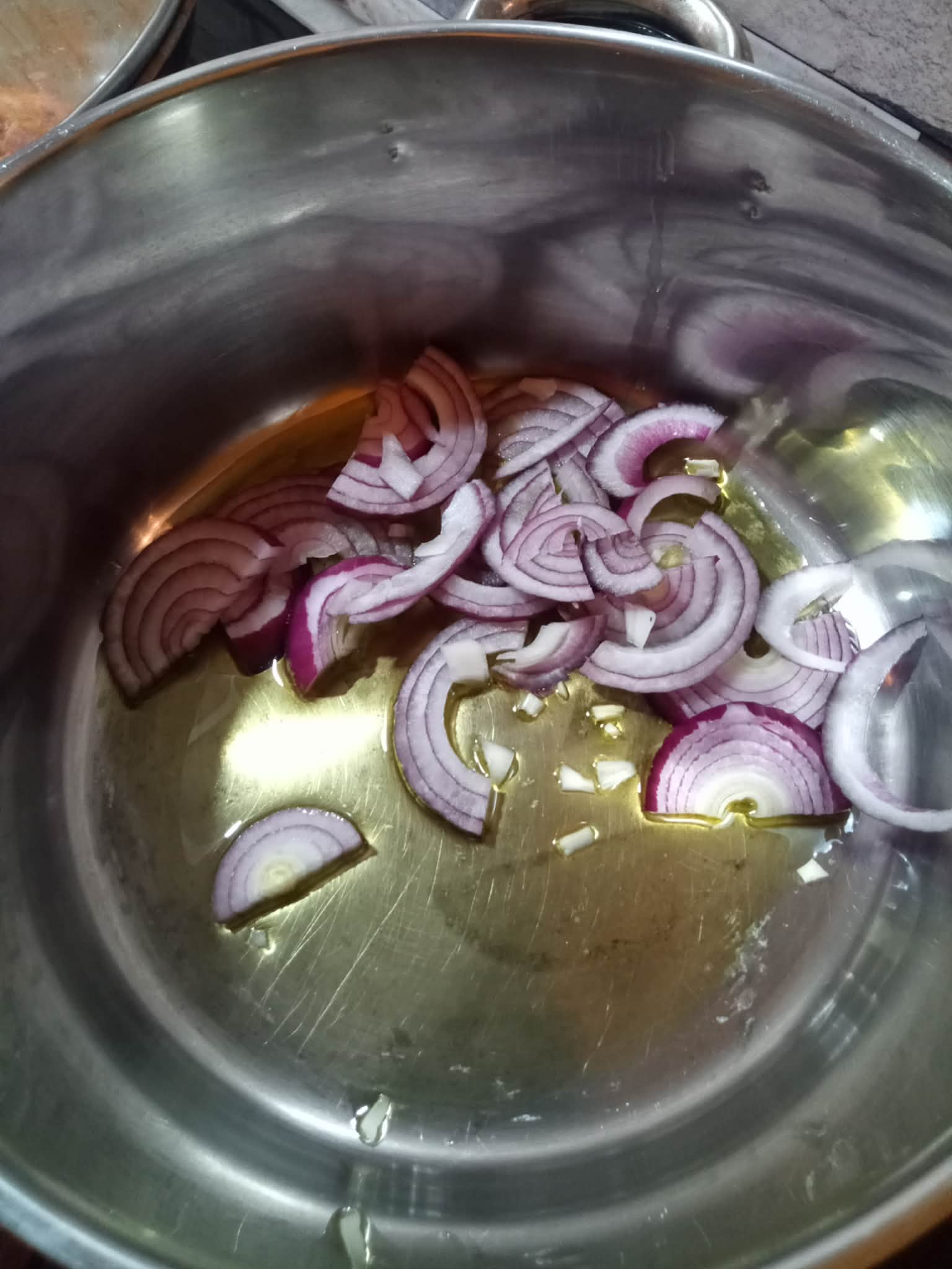 Im Olivenöl wird die in kleine Würfel geschnittene Zwiebel kurz glasig angebraten.