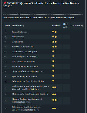 Wir müssen also vorbereitet in diese Wahl gehen. Verfassungstechnisch vorbereitet. Das Tiedemannsystem legt dem Laien ungeahnte Tatsachen offen. Es schildert nüchtern und überparteilich das Quorum, damit die Bürger darauf vorbereitet sind. Es geht tatsächlich jeden Wähler an und ist außerdem ein demokratisches Lehrstück für den Rest der Republik. Ob Himmelblau, Rechts, Mitte oder Links. Mit dem einfach zu begreifenden Tiedemannsystem erhältst du sogar einen Spickzettel für die Wahlkabine 2018 (nächste Folge). Damit gehen Demokraten und AFD–Wähler kompetent durchs Quorum. Lesen lohnt sich immer! Für die hessische Demokratie selbst ist es jetzt wichtig, dass ihre Bürger genau wissen, was sie tun. Sonst spielst du dem politischen Gegner in die Hände. Auch die Nichtteilnahme am Quorum entbindet dich nicht vom Gewicht der Quorum–Vorschläge. Selbst der, agitierte Nationalist sollte die nächste Folge lesen. Das Quorum könnte eine Chance sein. In der Schweiz wurden damit sogar Minarette verboten.