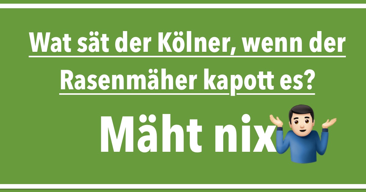 Witze op kölsch👍biggi (61)in #deutsch • 6 years ago (edited) Ne ahle Mann un e jung Frau kumme in ne Kneip herin. Sät dä Mann : E Schuss un ne Drecksack Sät dä wirt: Dat seh ich. Wat wullt ihr drinke? Was heißt Selfiestick op Kölsch? Bilderstöckchen @feuerelfe #humor #spass #witzig #lustig #koelsch