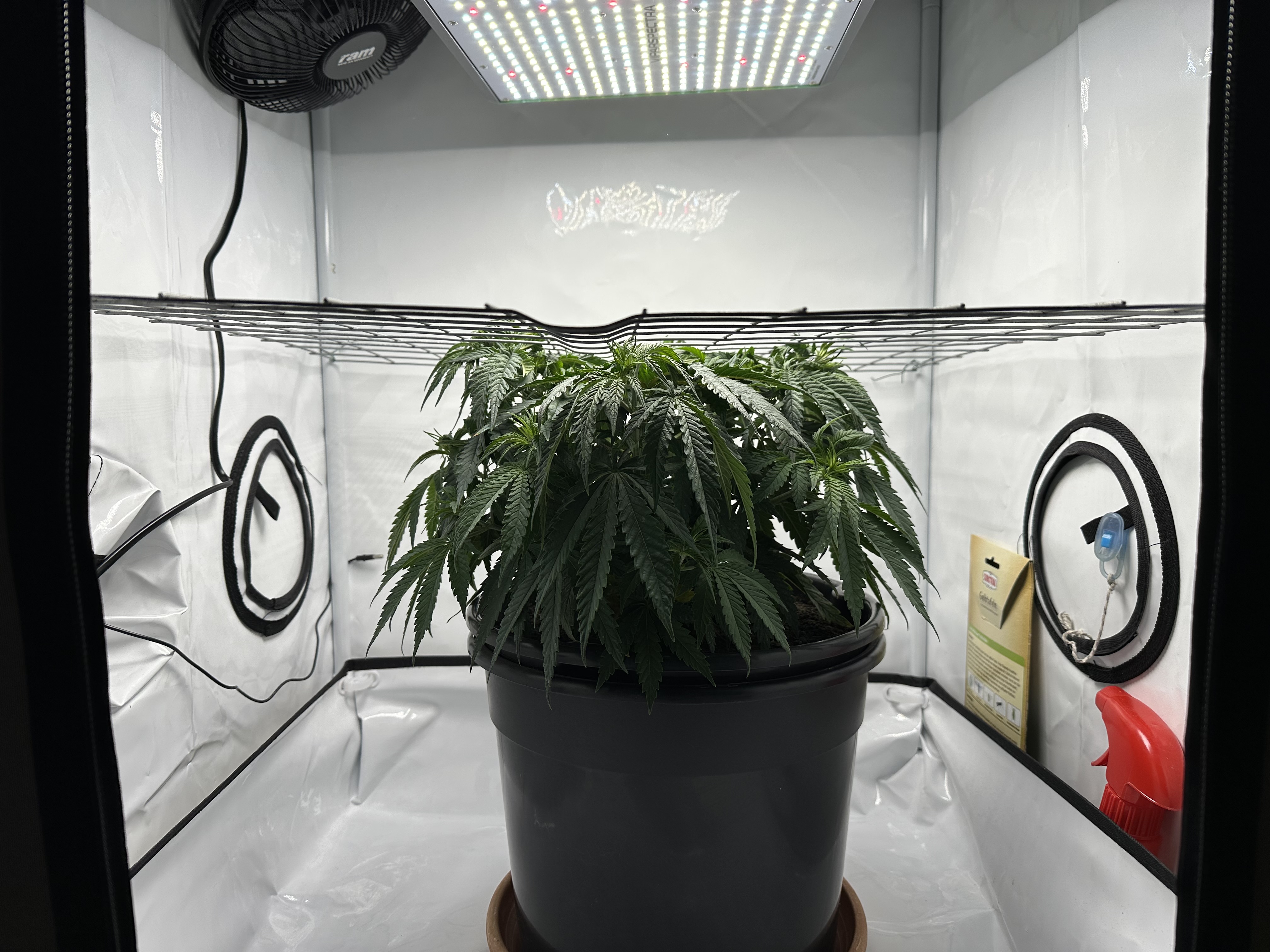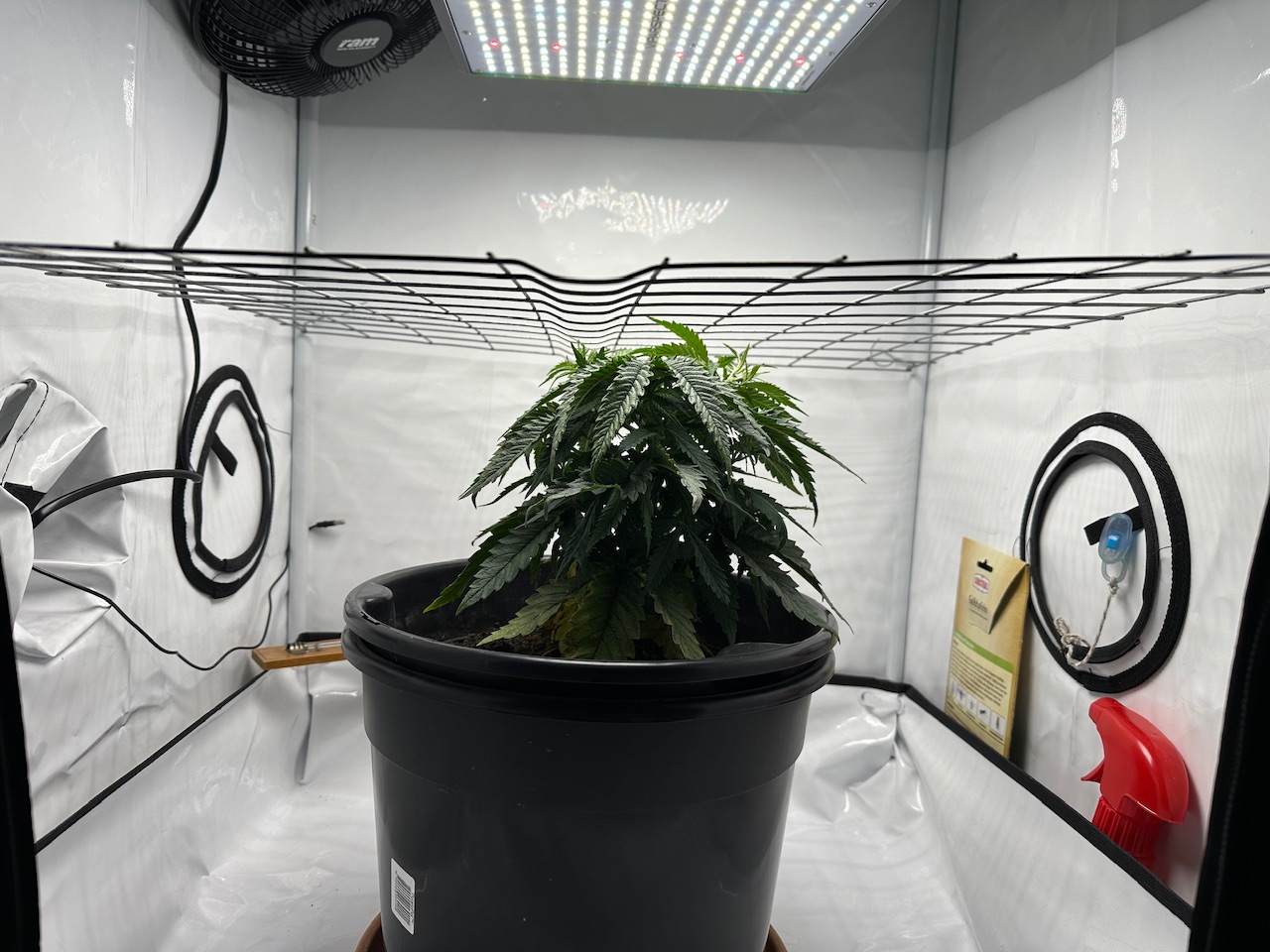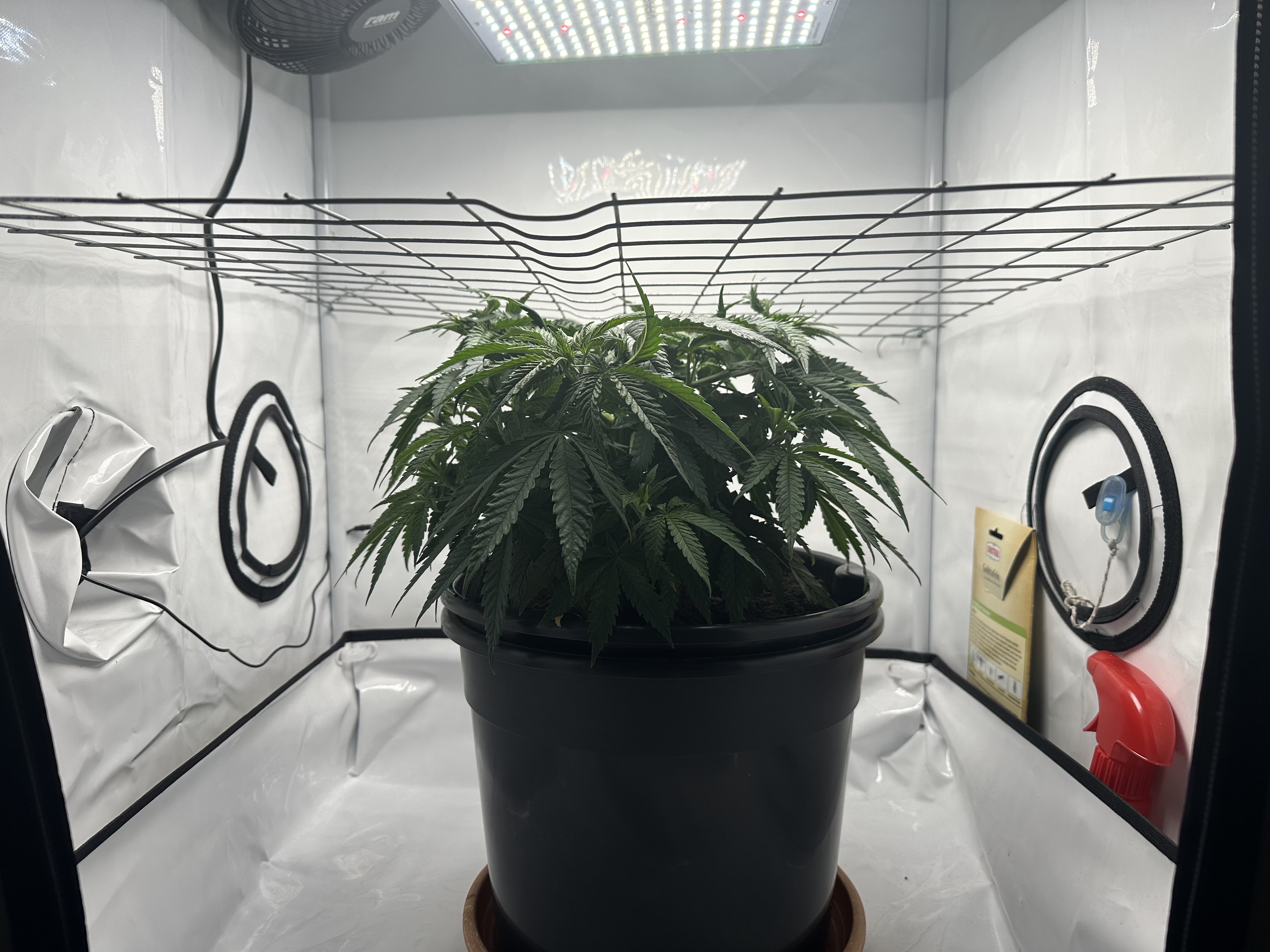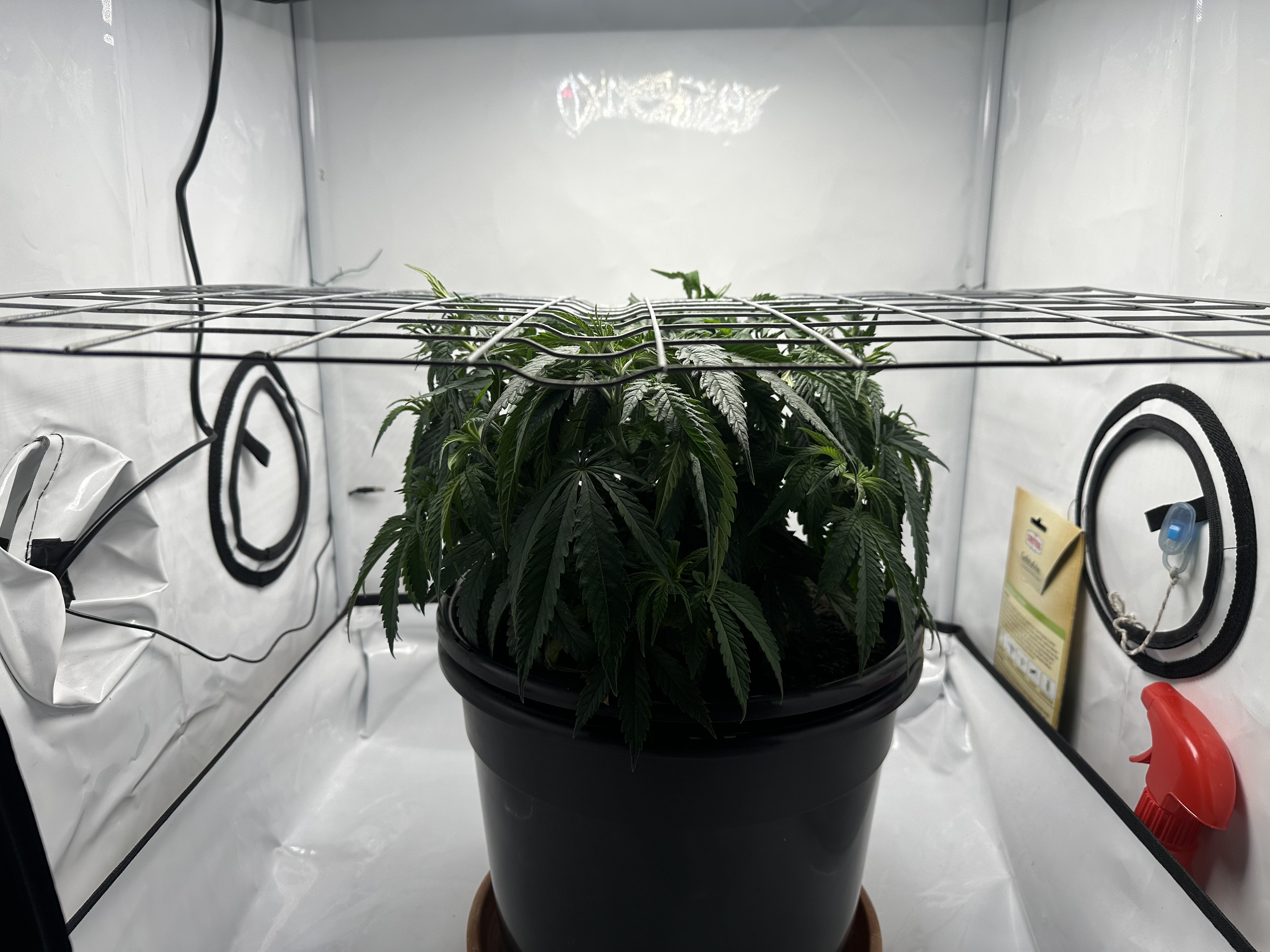 Ich habe im Schrank ein Gitter eingezogen und den Haupttrieb gekappt, mit dem Ziel die Pflanze mehr in die Breite zu zwingen: