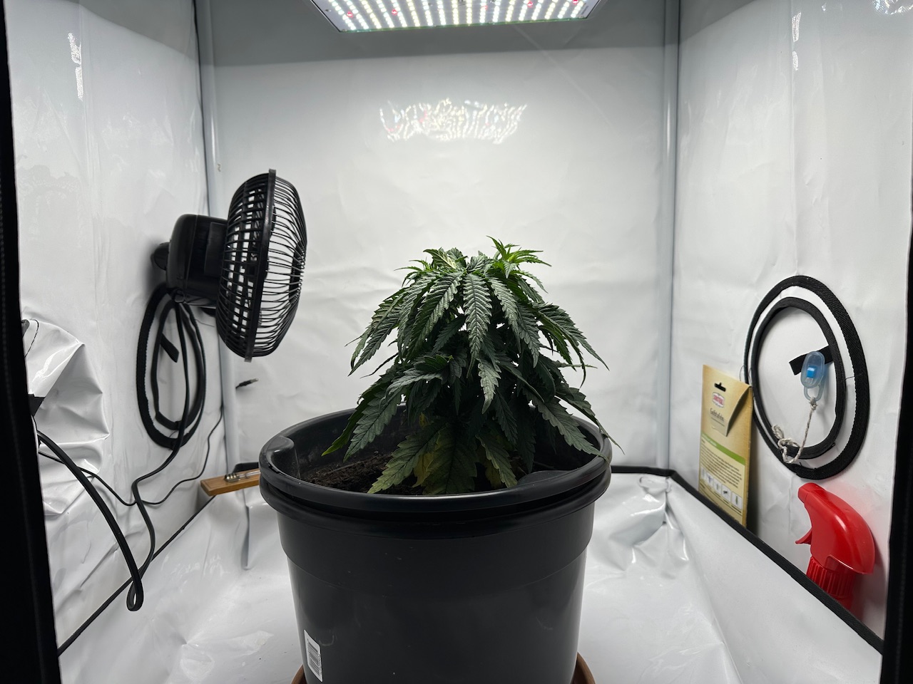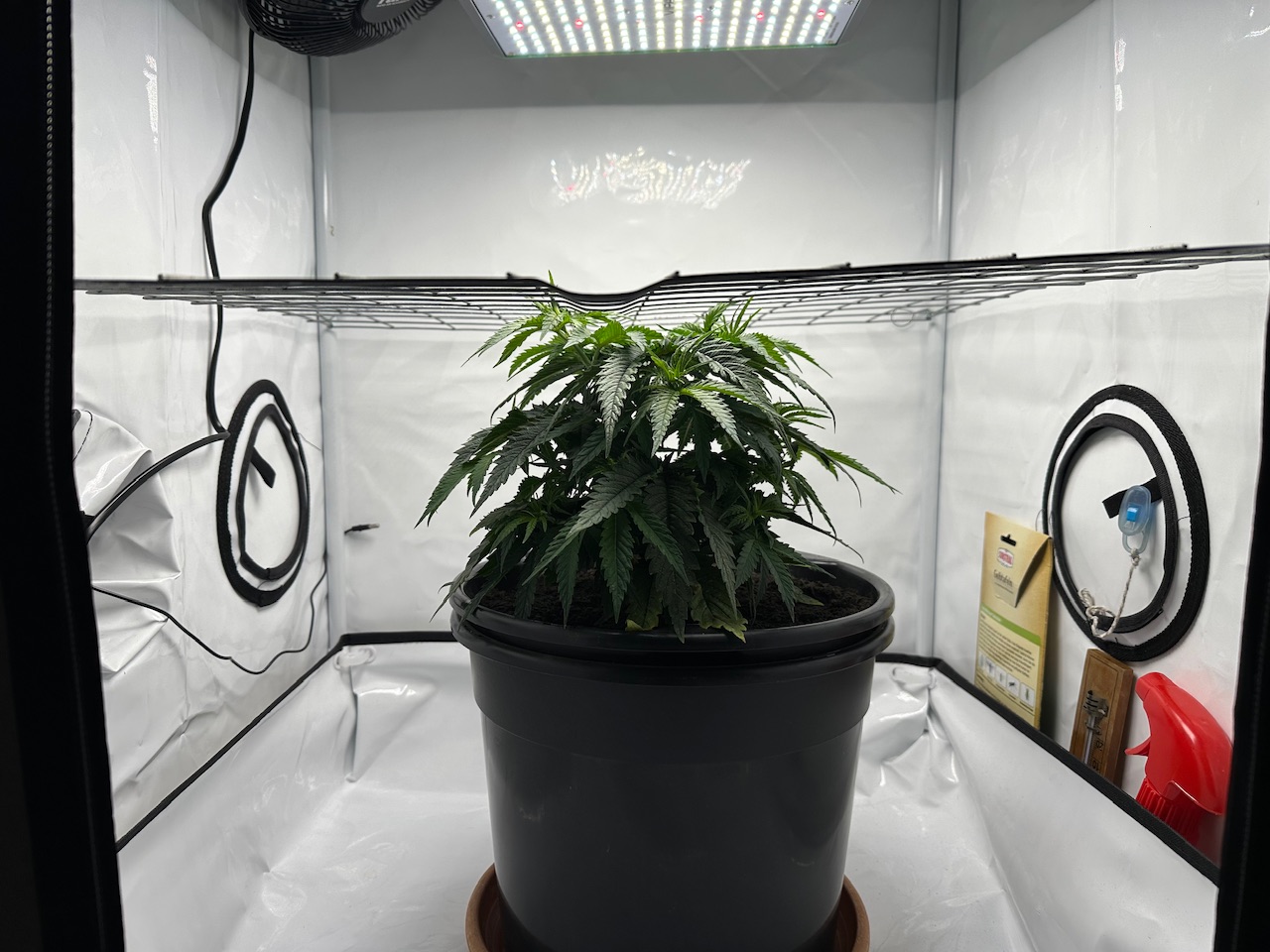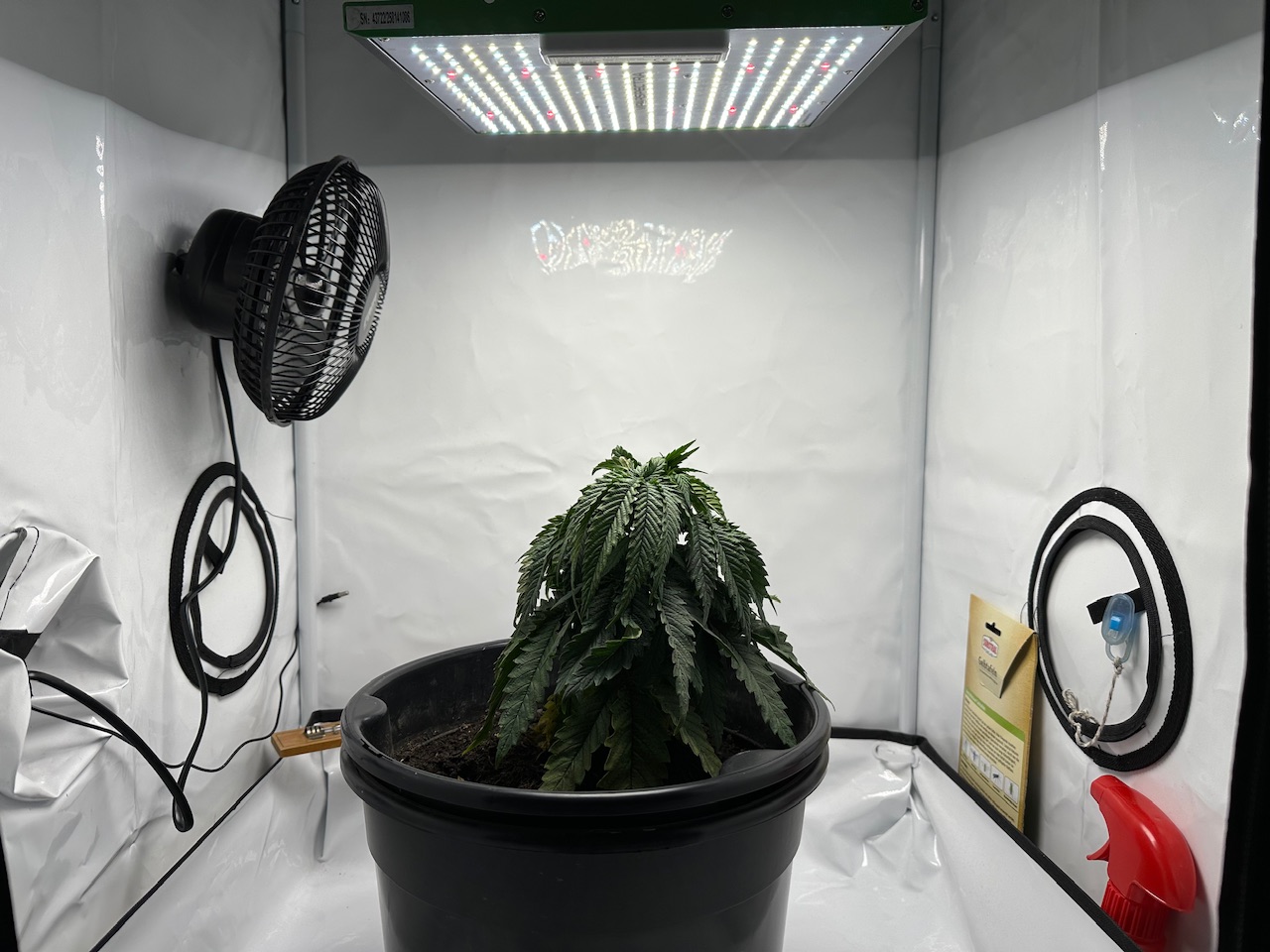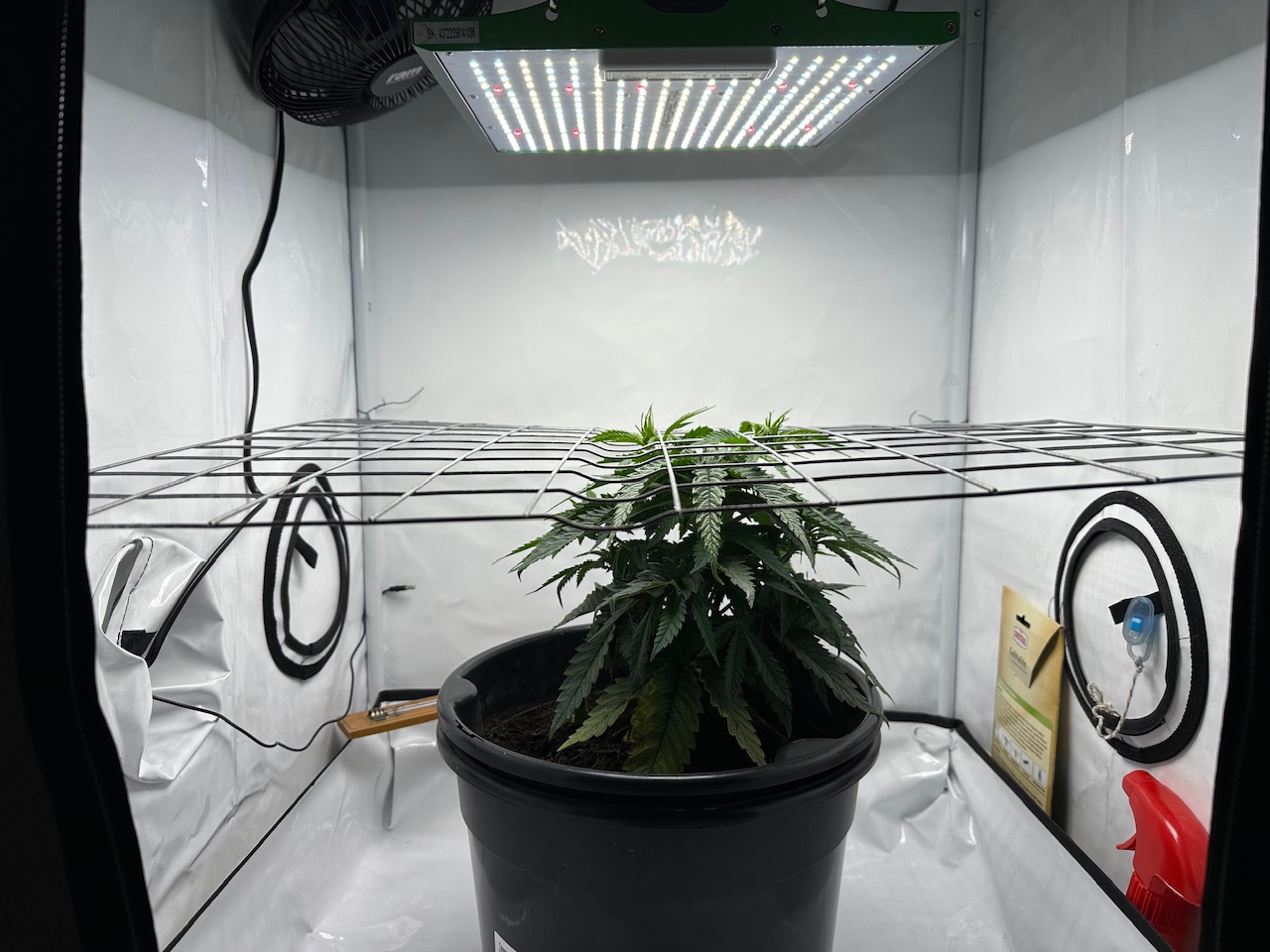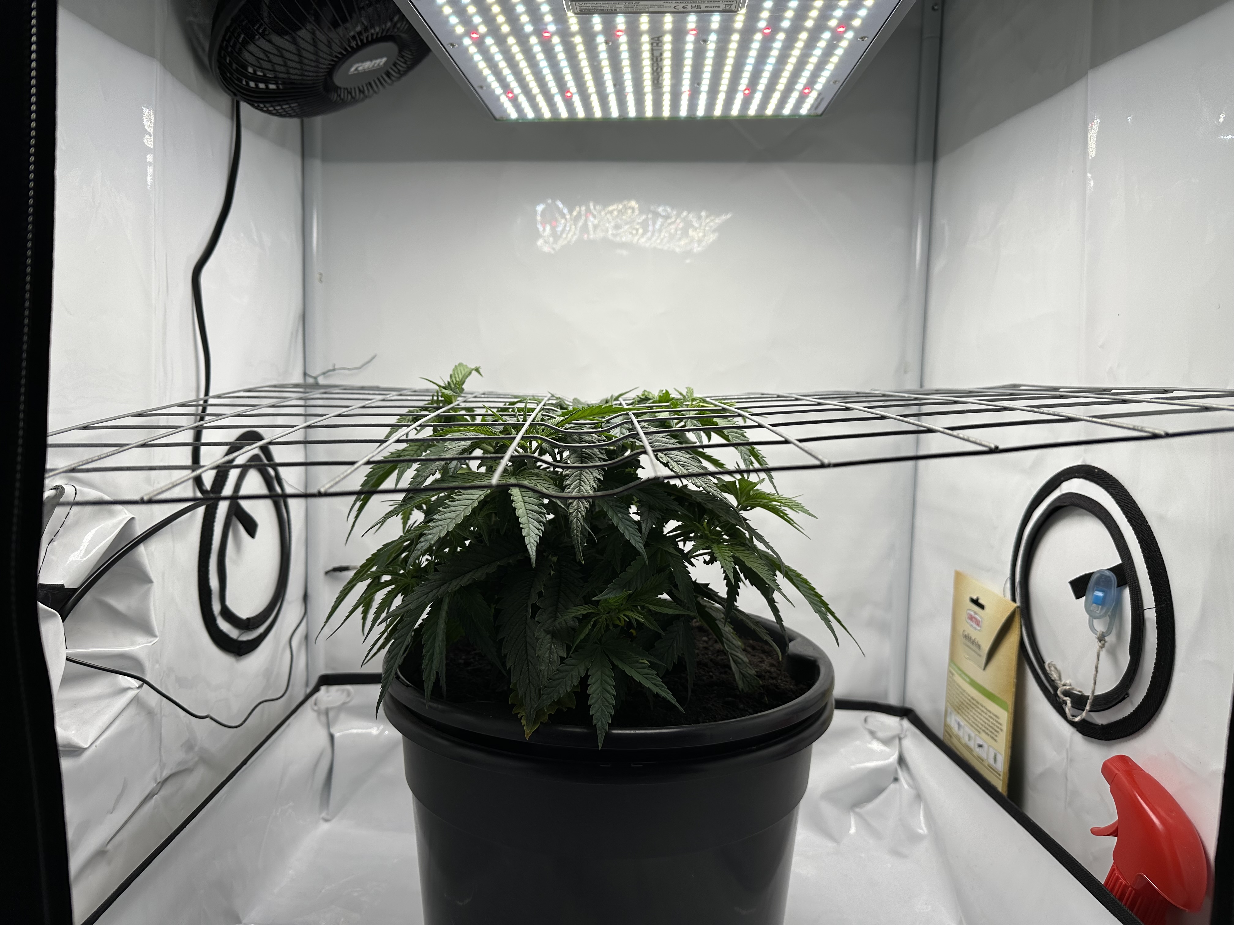 Ich habe im Schrank ein Gitter eingezogen und den Haupttrieb gekappt, mit dem Ziel die Pflanze mehr in die Breite zu zwingen: