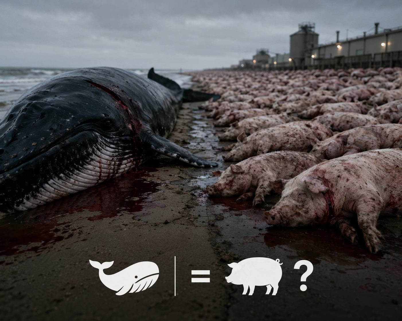 Und dann gehen dieselben Leute in den Discounter und kaufen sich das Schnitzel aus der schlechtesten Tierwohl-Klasse, weil es gerade im Angebot ist. Irgendein Schwein, das acht Monate unter Bedingungen aufgezogen wurde, die man sich nicht anschauen will. Aber das Schnitzel wird sich trotzdem reingezogen. Ohne Nachdenken, ohne Mitleid, ohne einen einzigen Gedanken daran, dass dieses Tier genauso gelitten hat wie der Wal da im Sand.