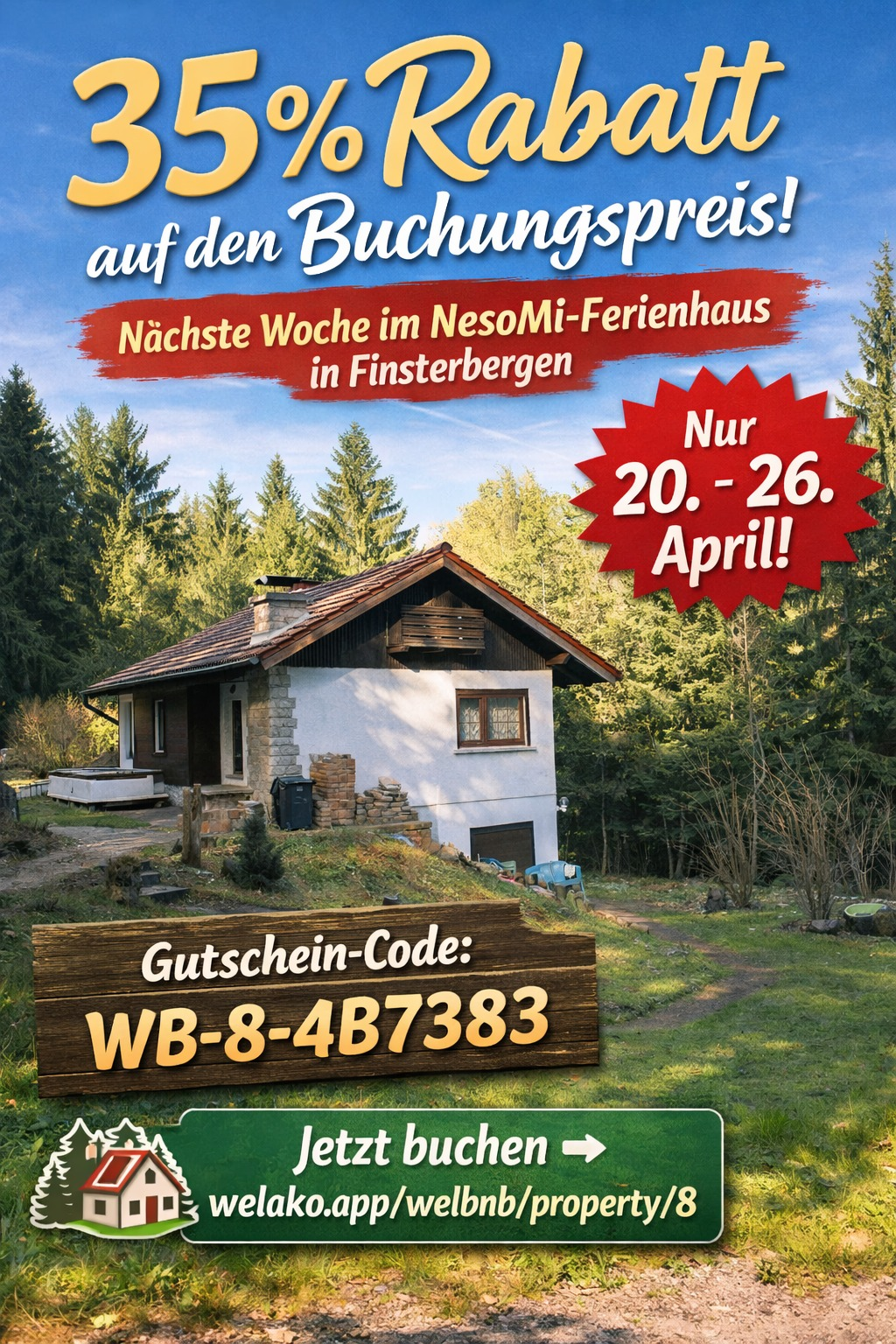 Um das Ganze jetzt schon mal live zu testen, gibt es einen Gutschein über 35 %, der nur für den Buchungszeitraum 20. bis 26. April gilt. Vielleicht hat ja wirklich jemand so kurzfristig Zeit und kann im Laufe der nächsten Woche anreisen 😊