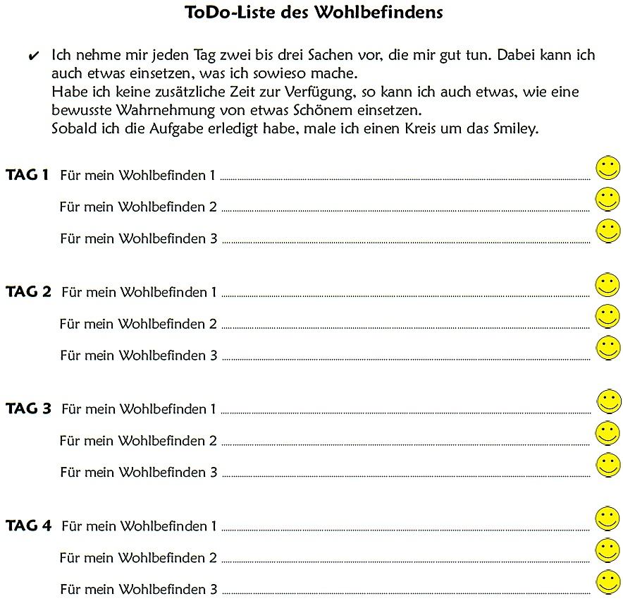 Es sollten nur sehr wenige Punkte auf dieser Extra-Selbstbestätigungs-ToDo-Liste stehen. Alle Aufgaben sollten ganz sicher zu erledigen sein, und es muss dir unbedingt, auch nach dem Machen der ToDo-Liste, noch viel Zeit für andere Aufgaben bleiben.