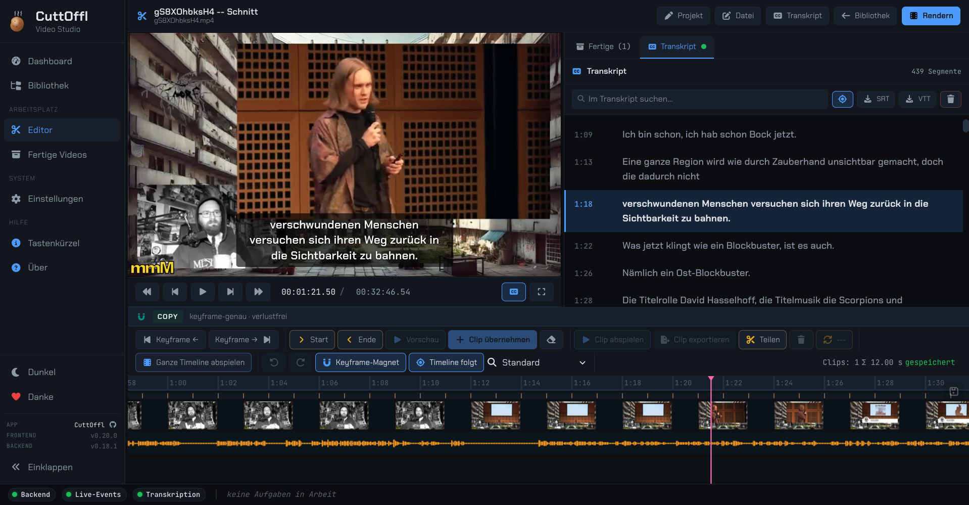 Whisper kann lokal dazu installiert werden, drei Engines zur Auswahl: mlx-whisper für Apple Silicon, faster-whisper für Pi4/5, Linux, openai-whisper als Referenz. CuttOffl scannt dabei deinen HuggingFace-Cache und die Whisper-Standardpfade mit, damit nicht unnötig Modelle doppelt runtergeladen werden.