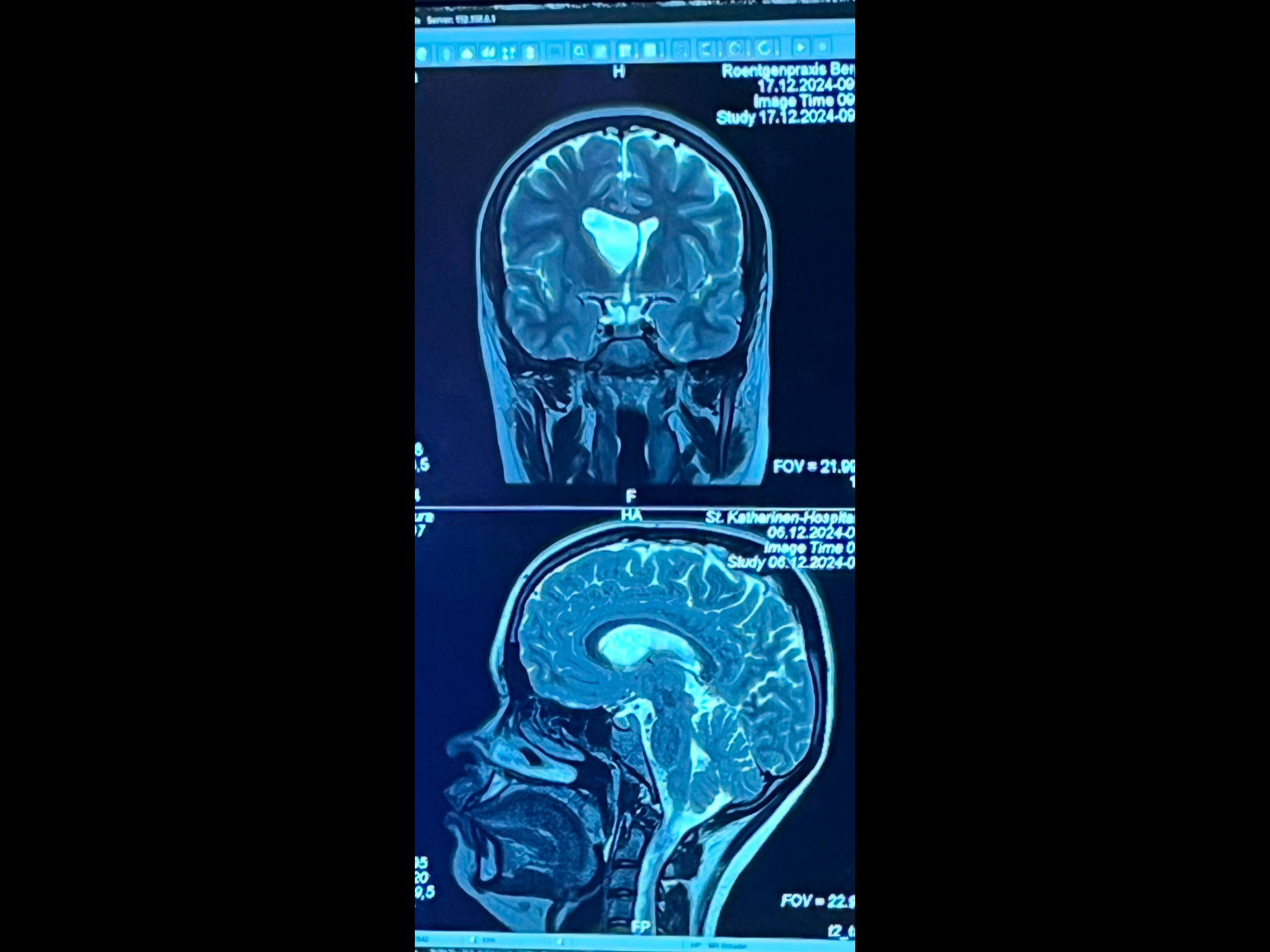 Es könnte sich allerdings, sofern es die restlichen Bilder hergeben, bei der Vergrößerung des linken Seitenventrikels mit Verlagerung der Mittellinie und Kompression des rechten Ventrikels um ein symptomatische angeborene Arachnoidalzyste handeln.