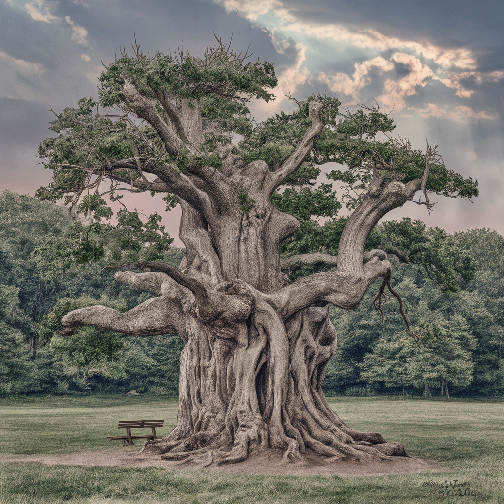 Ich habe viele Generationen von Menschen kommen und gehen sehen, ihre Freuden und Leiden miterlebt, während ich hier bleibe, fest an meinem Platz. Im Laufe der Jahre habe ich die Landschaft um mich herum verändern sehen, wie sich Wälder lichten und Städte wachsen, aber ich selbst habe mich nur langsam verändert, meine Äste und Blätter sich im Rhythmus der Jahreszeiten bewegend.