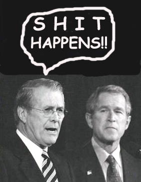 Von dem nun verstorbenen ehemaligen US-Verteidigungsminister Donald Rumsfeld ist die nonchalante Aussage „Shit happens!“ als Kommentar zu Kollateralschäden während des illegalen Irak-Einsatzes der US-Streitkräfte überliefert. Paraphrasiert als „Wo gehobelt wird, fallen Späne.“, steht dies für die generelle Haltung eines Politikers, der von Skrupeln nicht geplagt ist, sondern für den der Zweck die Mittel heiligt.