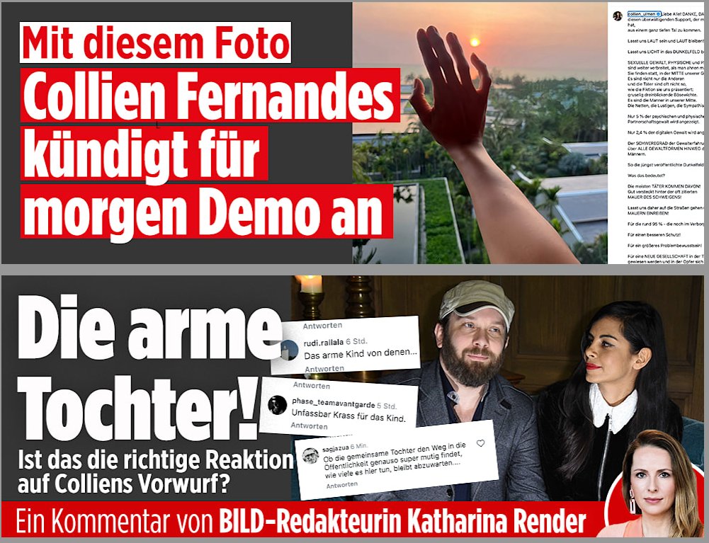 Diesen Sonntag soll eine Demonstration stattfinden, die offiziell Collien Fernandes zugeschrieben wird. Die Inszenierung ist bereits jetzt klar erkennbar: Eine große rote Schlagzeile, ein dramatisches Hand-im-Sonnenuntergang-Foto – Symbolik für Aufbruch, Protest, Hoffnung – und darunter der Kommentar der Redakteurin Katharina Render zur „armen Tochter“. Das Ganze wirkt wie ein gezielter Push für Empörung und Solidarität. Für viele Beobachter wirkt das pathetisch und kalkuliert.