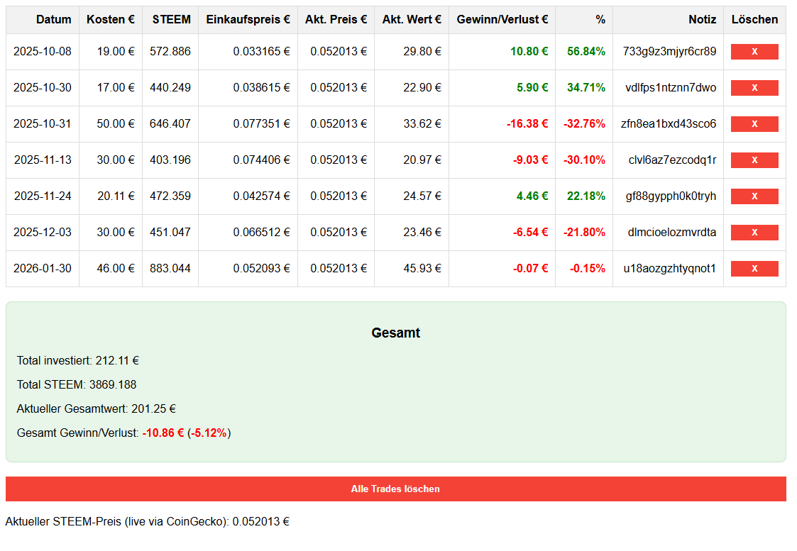 Total investiert → Total STEEM → Aktueller Wert → Echter Gesamtgewinn/Verlust