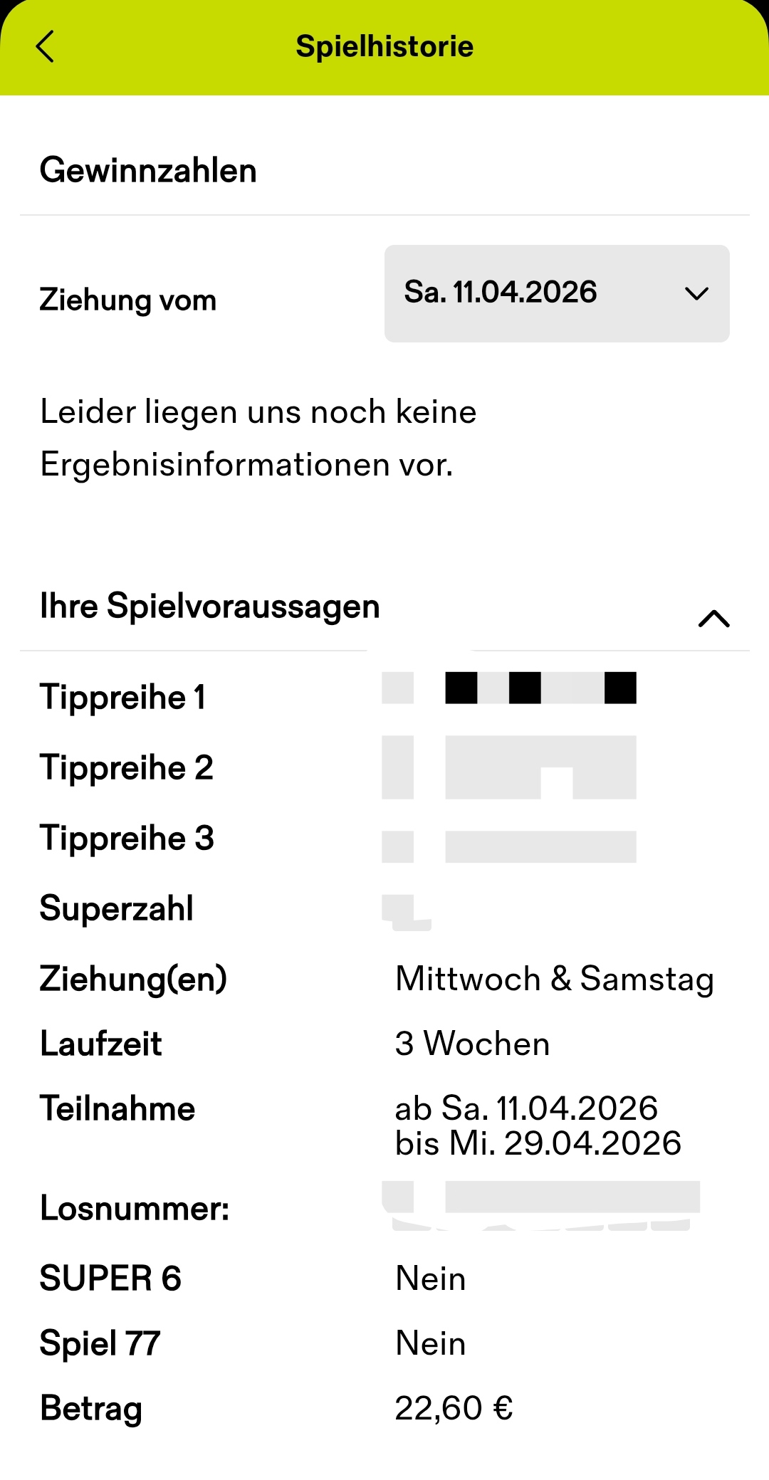 Der heutige Tipppost berechtigt nur zur Teilnahme an der Ziehung am 18.4.2026 - für alle anderen Ziehungen ist das zuvor genannte Prozedere in einem gesonderten Tippbeitrag erneut erforderlich. Dabei ist darauf zu achten, ob die bislang bestehenden Bedingungen weiterhin Gültigkeit haben oder sich verändert haben.