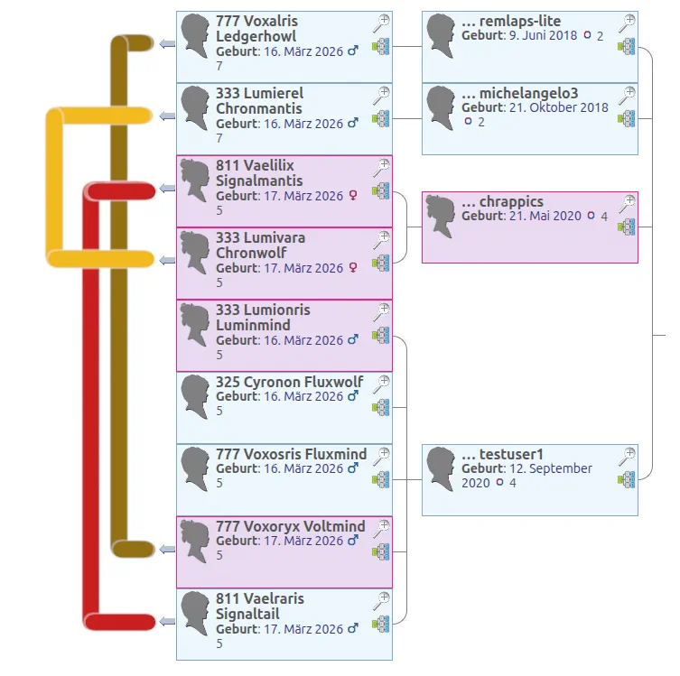 Ich kann mir die Namen der Babys ganz schlecht merken, drum hab sie in einem alten Stammbaumprogramm eingetragen, furchtbar das Teil. Aber so sieht man wenigstens die möglichen Partner in späh: