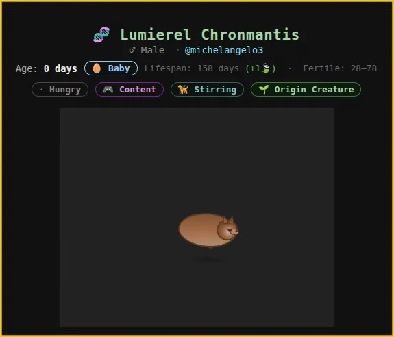 Soweit ich das bisher sehe, reicht es sich einmal am Tag darum zu kümmern. Bei Gattung und Geschlecht muss man halt schauen, dass man "kompatible" Babys hat. Bin ja gespannt, wie sich das zukünftig entwickelt oder ob wir aussterben, weil zu wenig Exemplare da sind.