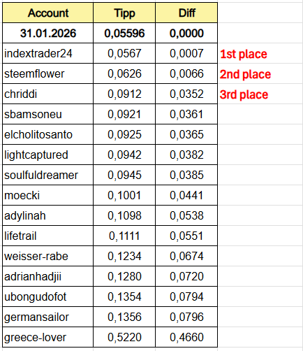 Genug geredet, Zeit die Gewinner aus unserem Ratespiel zu ermitteln und die Preise auszuzahlen. Preisbasis ist der Close-Kurs auf coingecko.com zum 31.01.2026, hier ist der Screenshot: