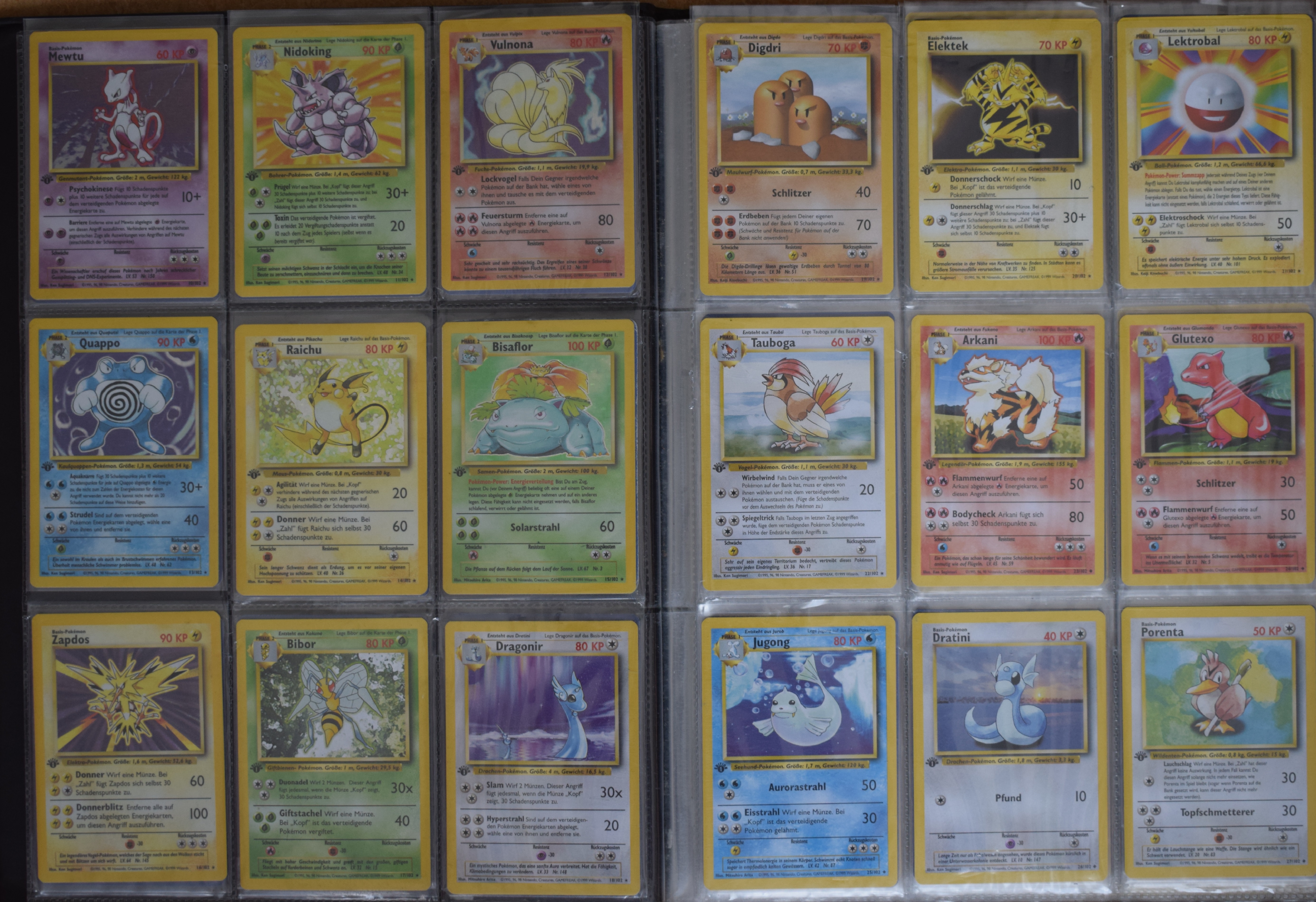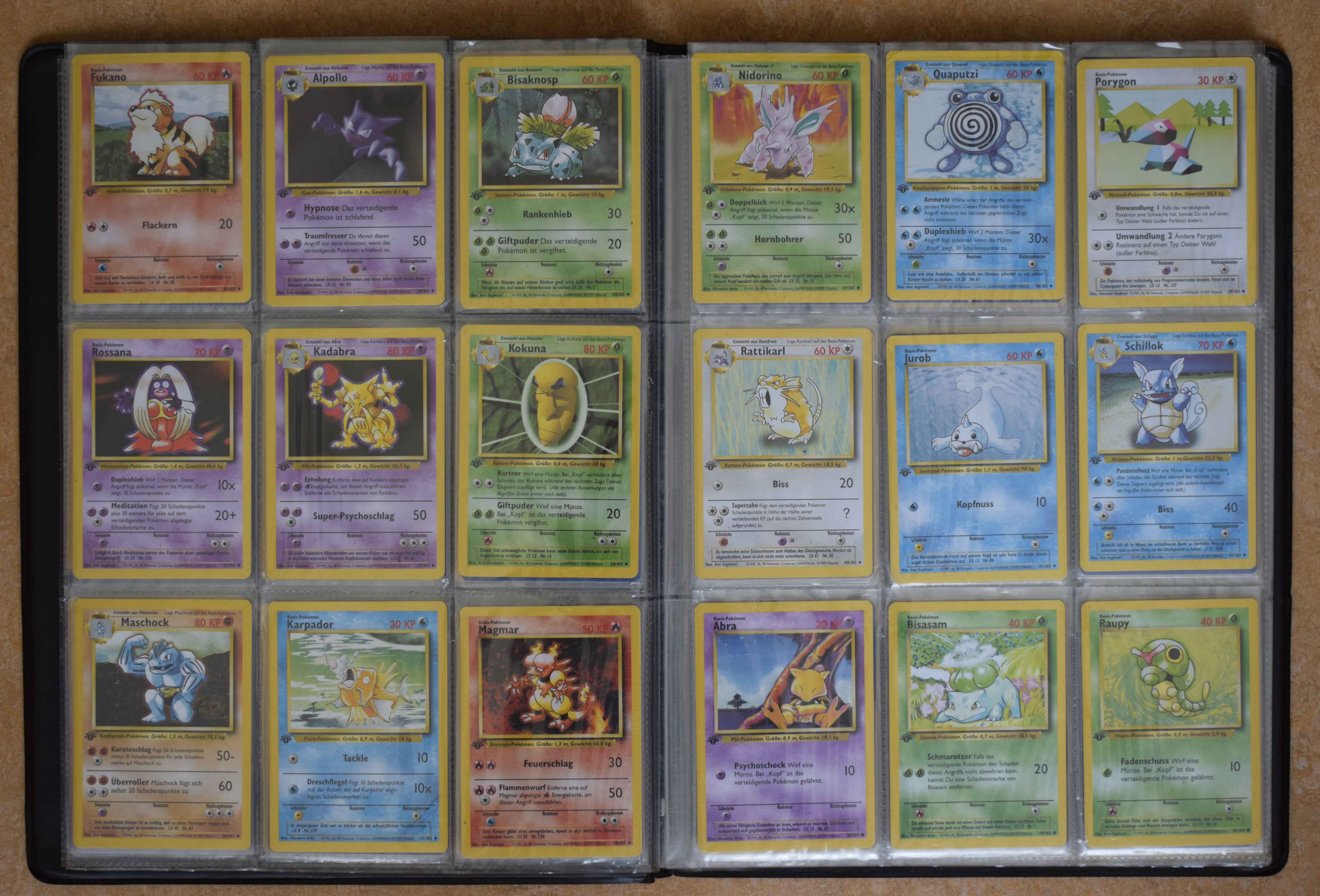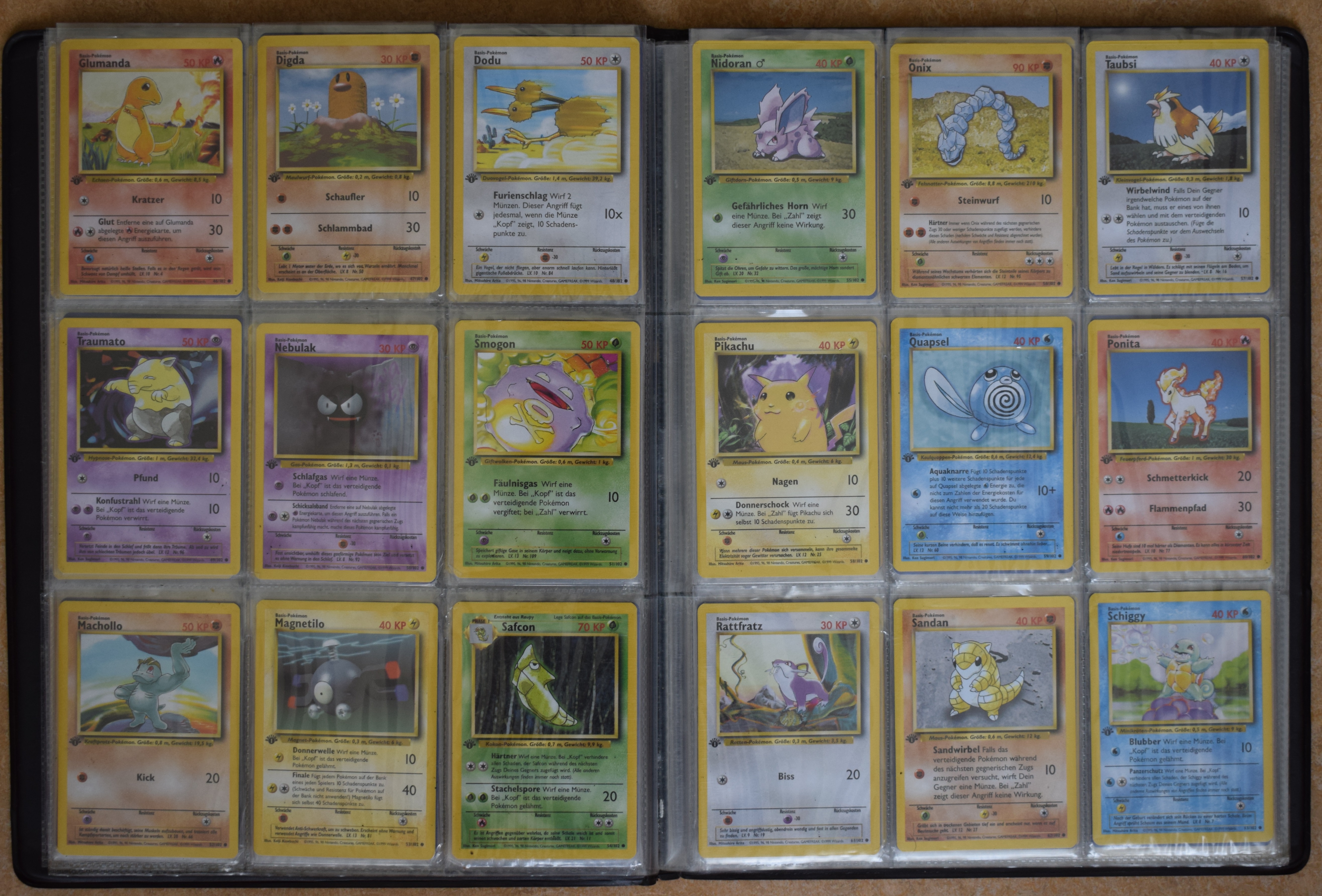 Nach langer Suche auf Ebay wurde auch ich fündig und ersteigerte ein komplettes 1st Edition Base Set für nur 300 Euro (ohne Glurak). Vor allem wollte ich das Set weil es das aller erste Set war von Pokemon und dazu noch in der ersten Edition das mich in Nostalgie nur so schwimmen liess.
