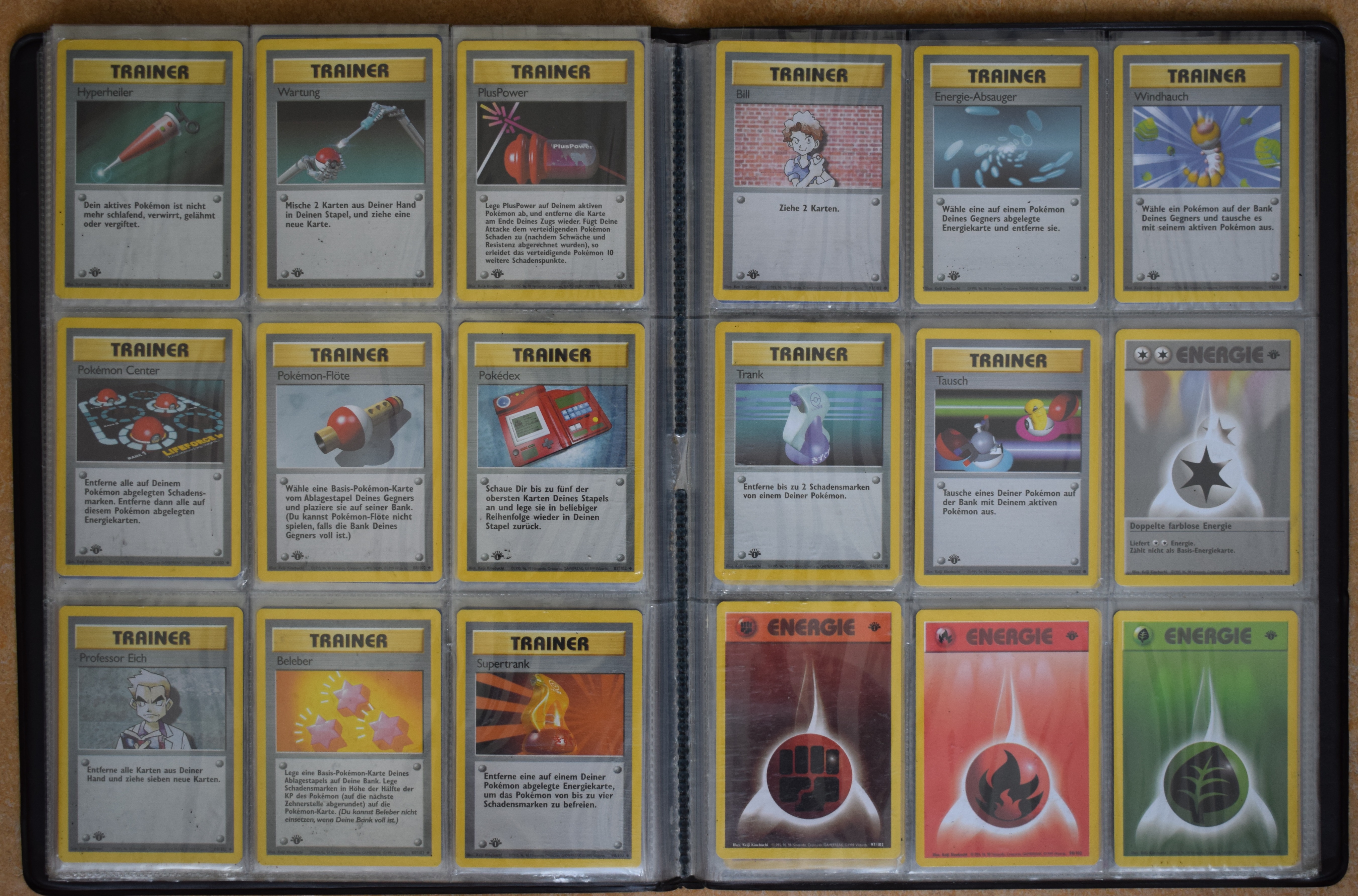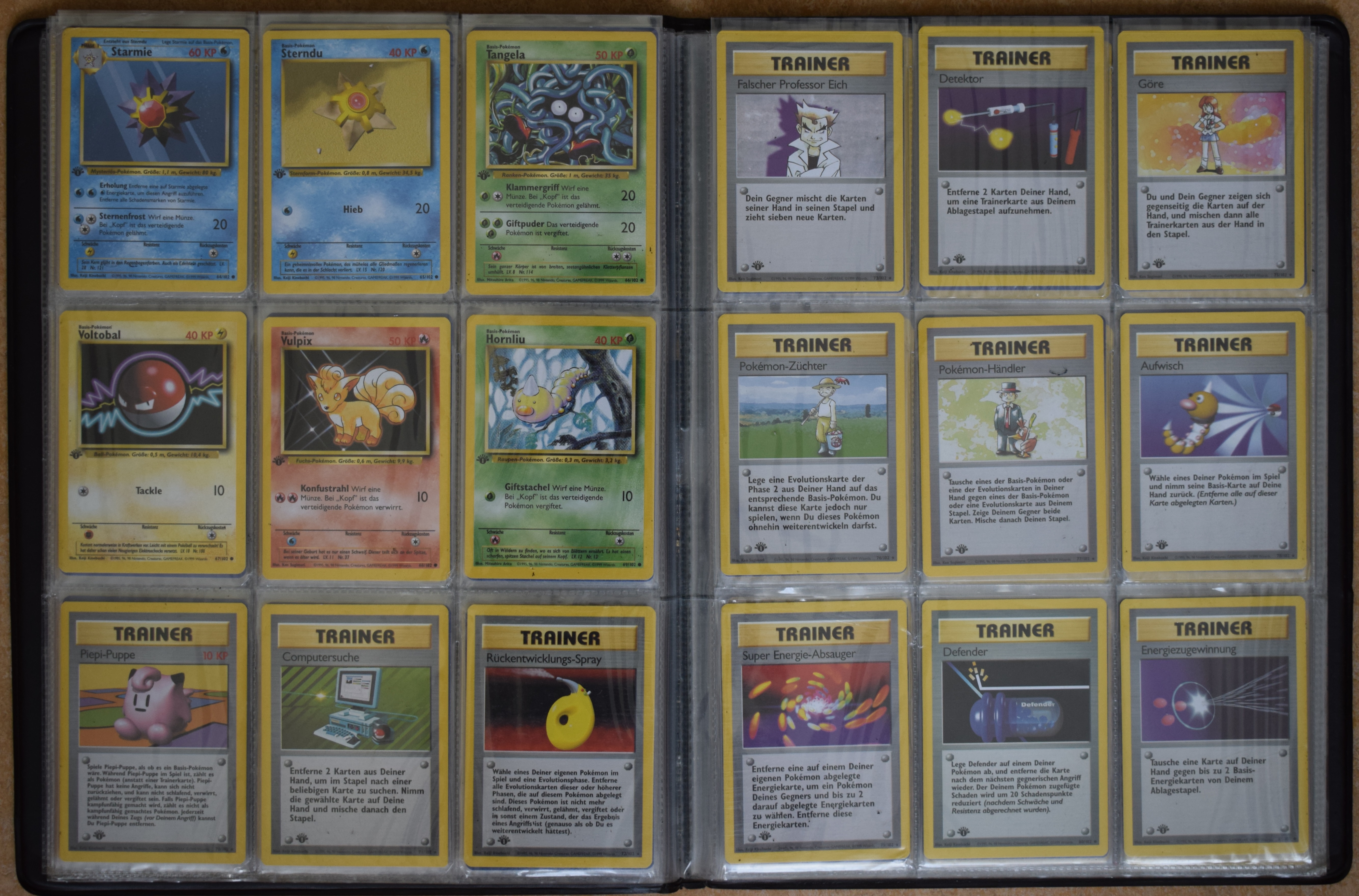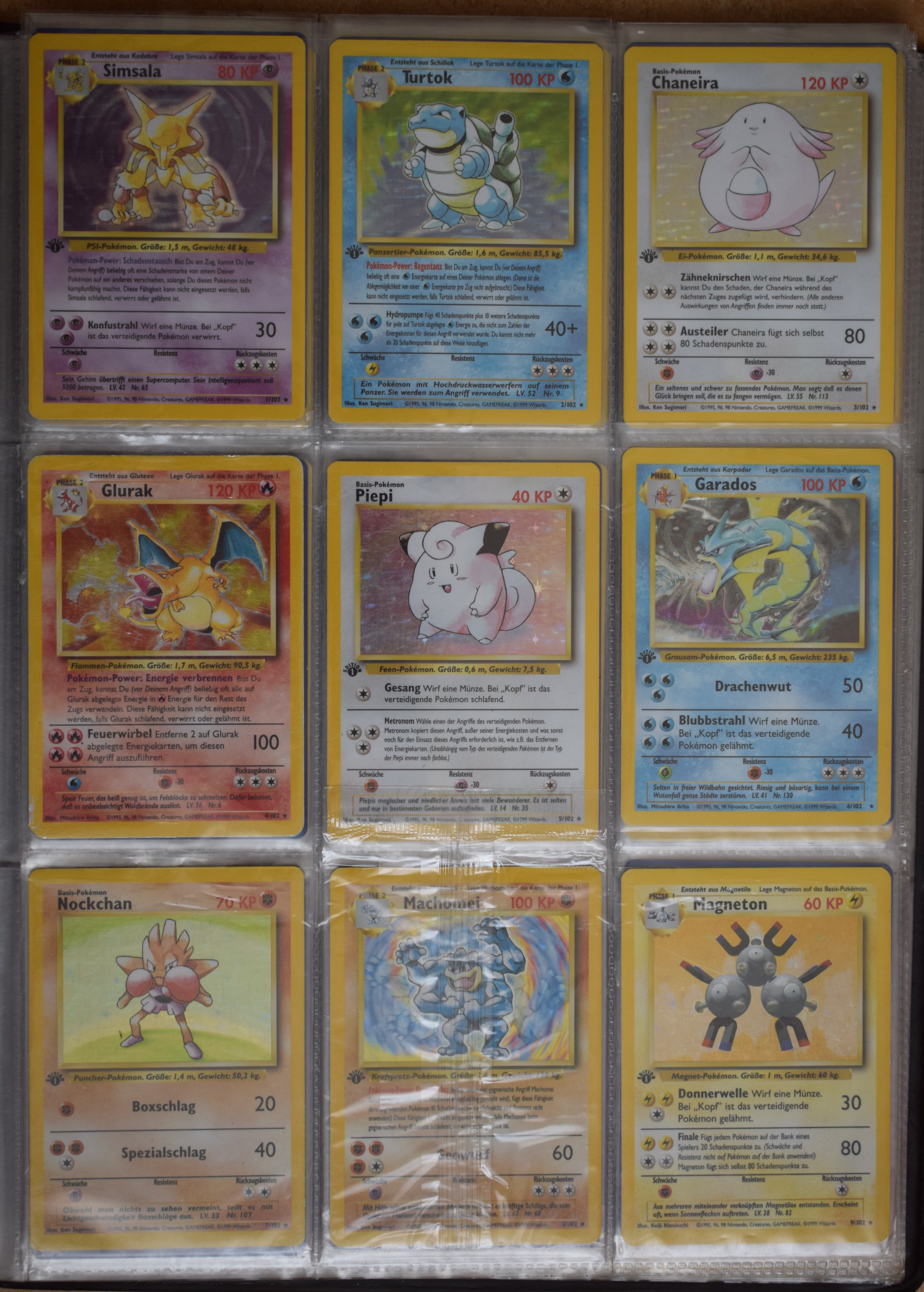 Nach langer Suche auf Ebay wurde auch ich fündig und ersteigerte ein komplettes 1st Edition Base Set für nur 300 Euro (ohne Glurak). Vor allem wollte ich das Set weil es das aller erste Set war von Pokemon und dazu noch in der ersten Edition das mich in Nostalgie nur so schwimmen liess.