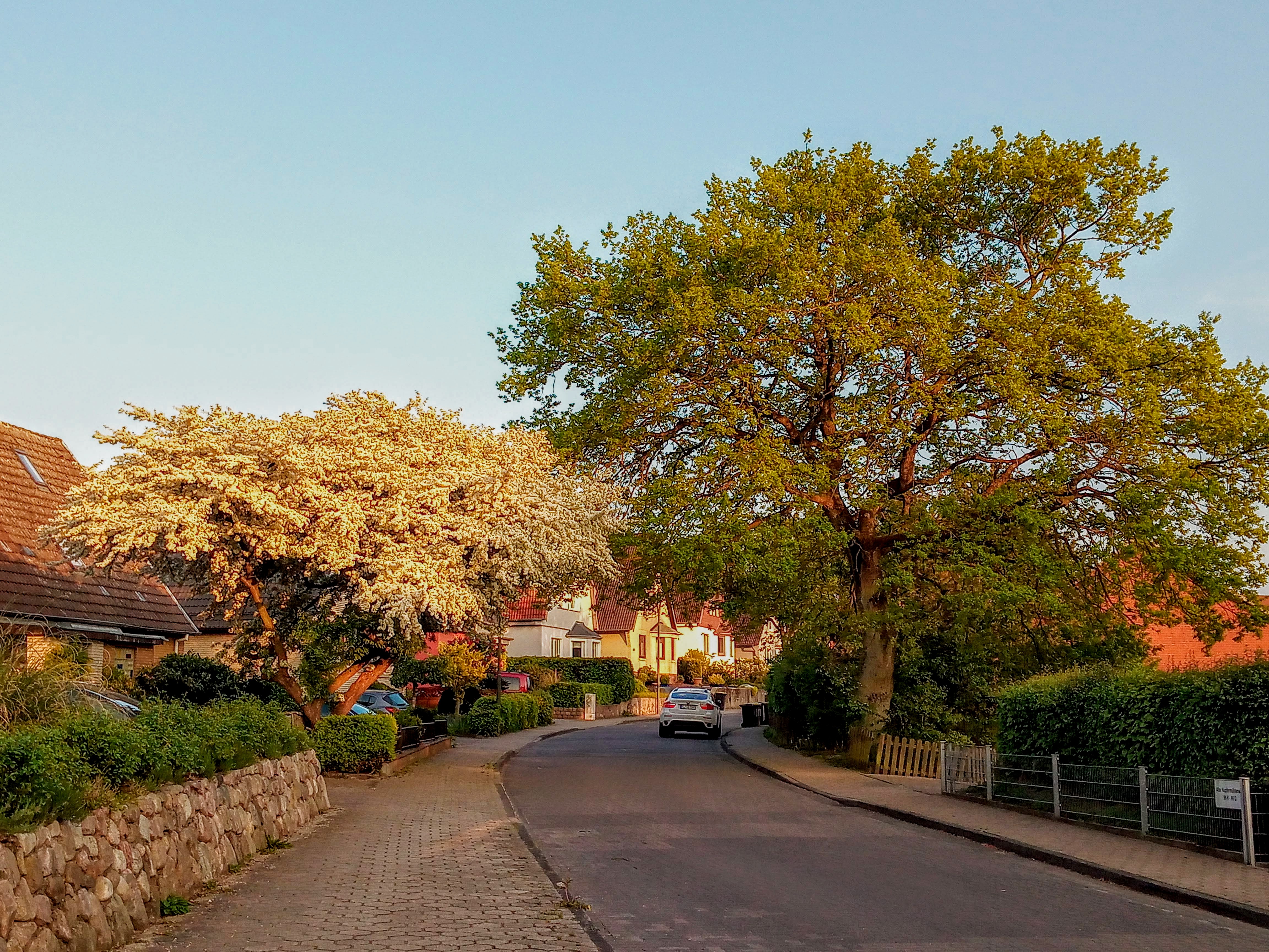 Baumgeschwister, getrennt durch eine Strasse, dreissiger Zone.