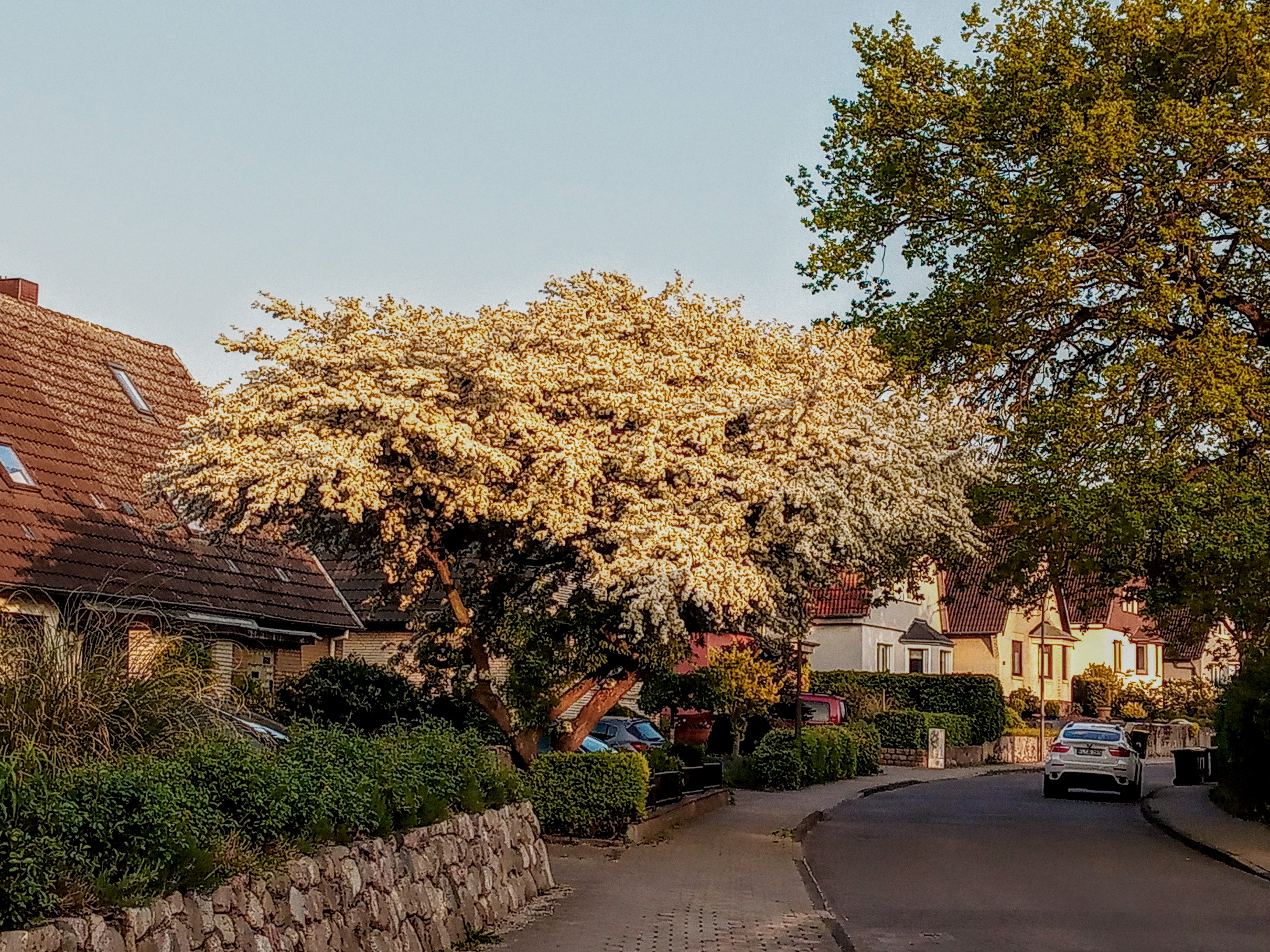 Der Weissdorn ist übersäht mit Blüten, eine einzige Blüte möchte man meinen. Stellt man sich unter sie kann man ihren Duft fast trinken.