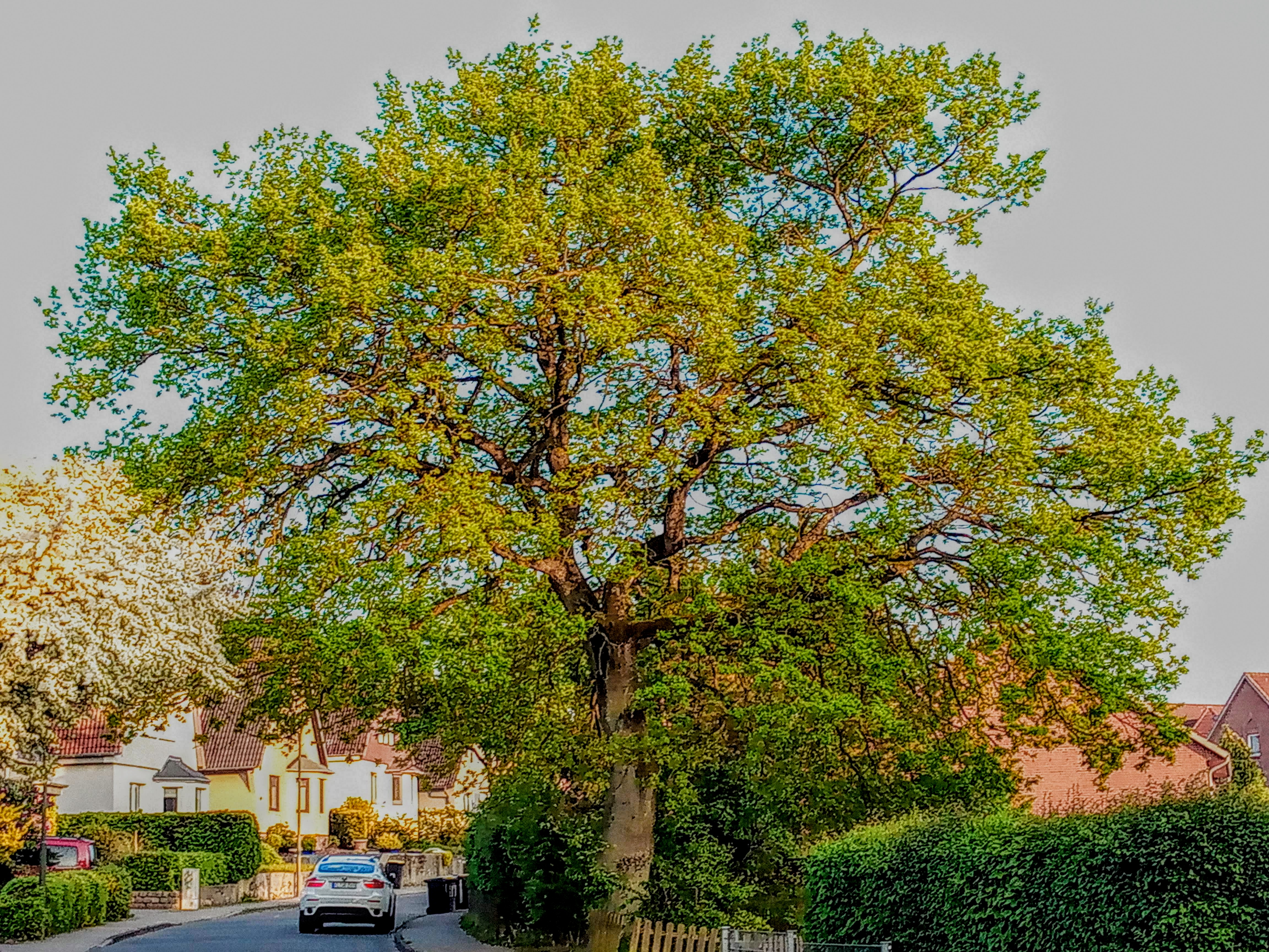 Die Eiche versucht es ihrem Geschwister gleich zu tun, blüht unsichtbar im hellsten Grün des Jahres.