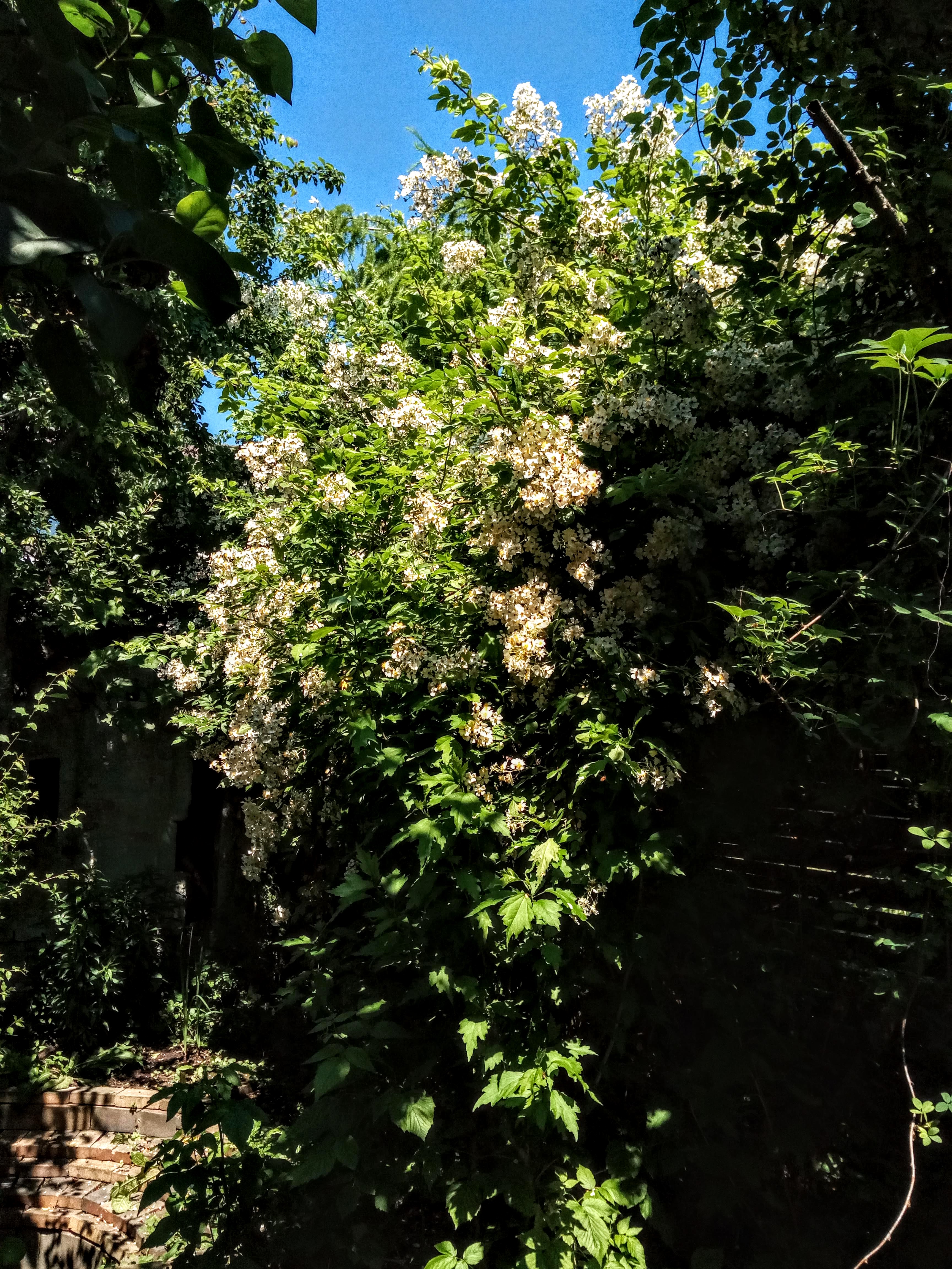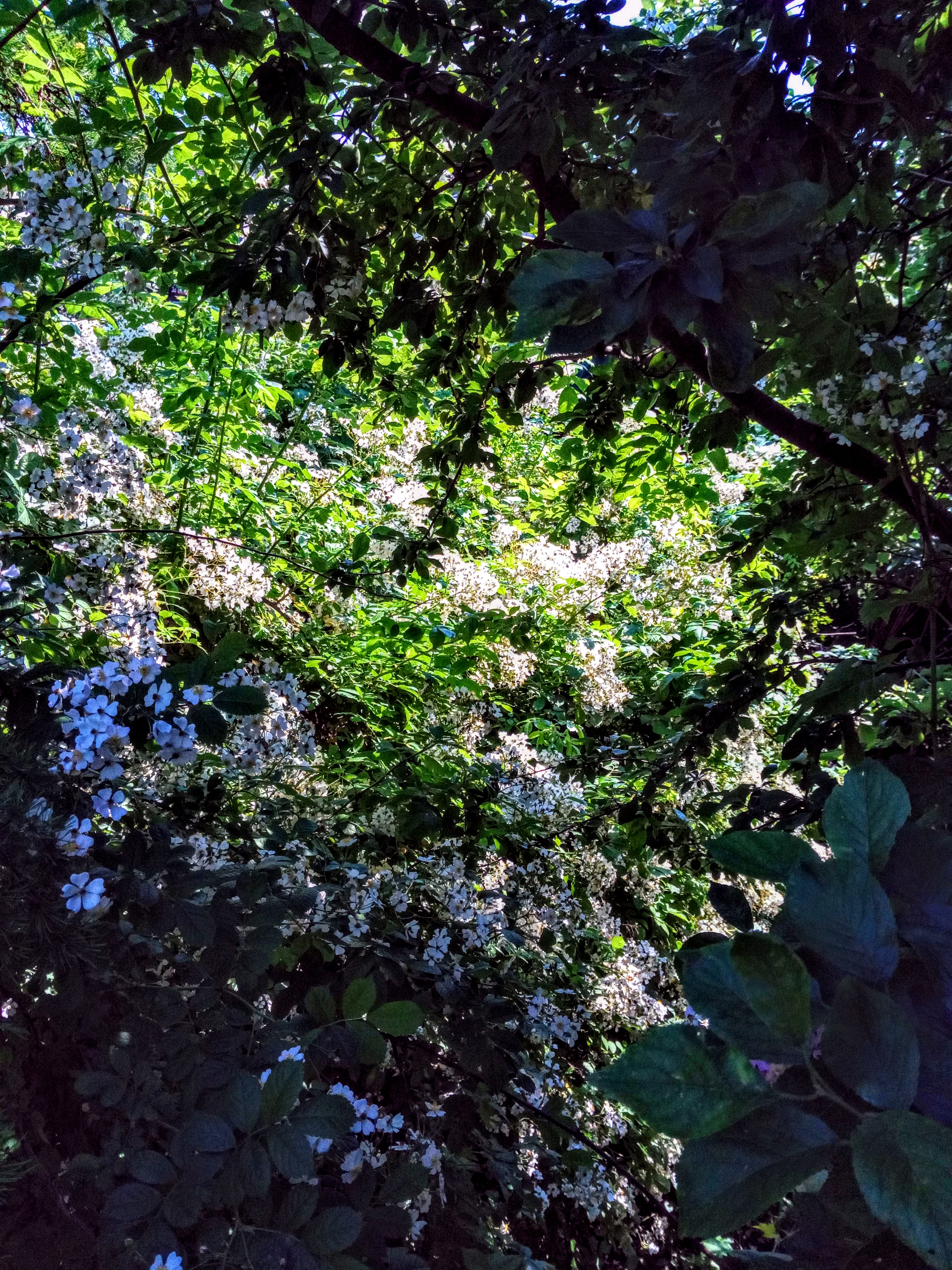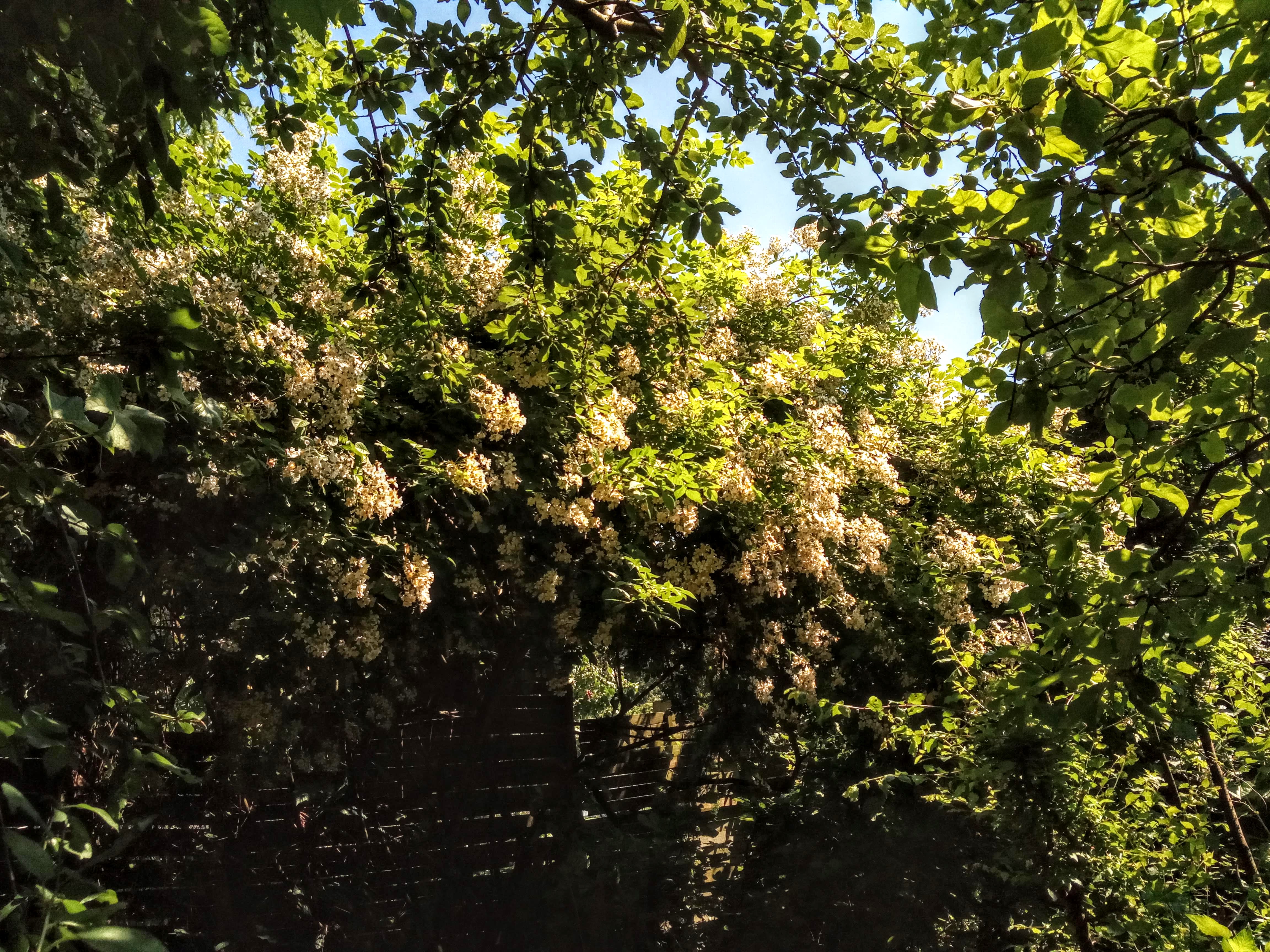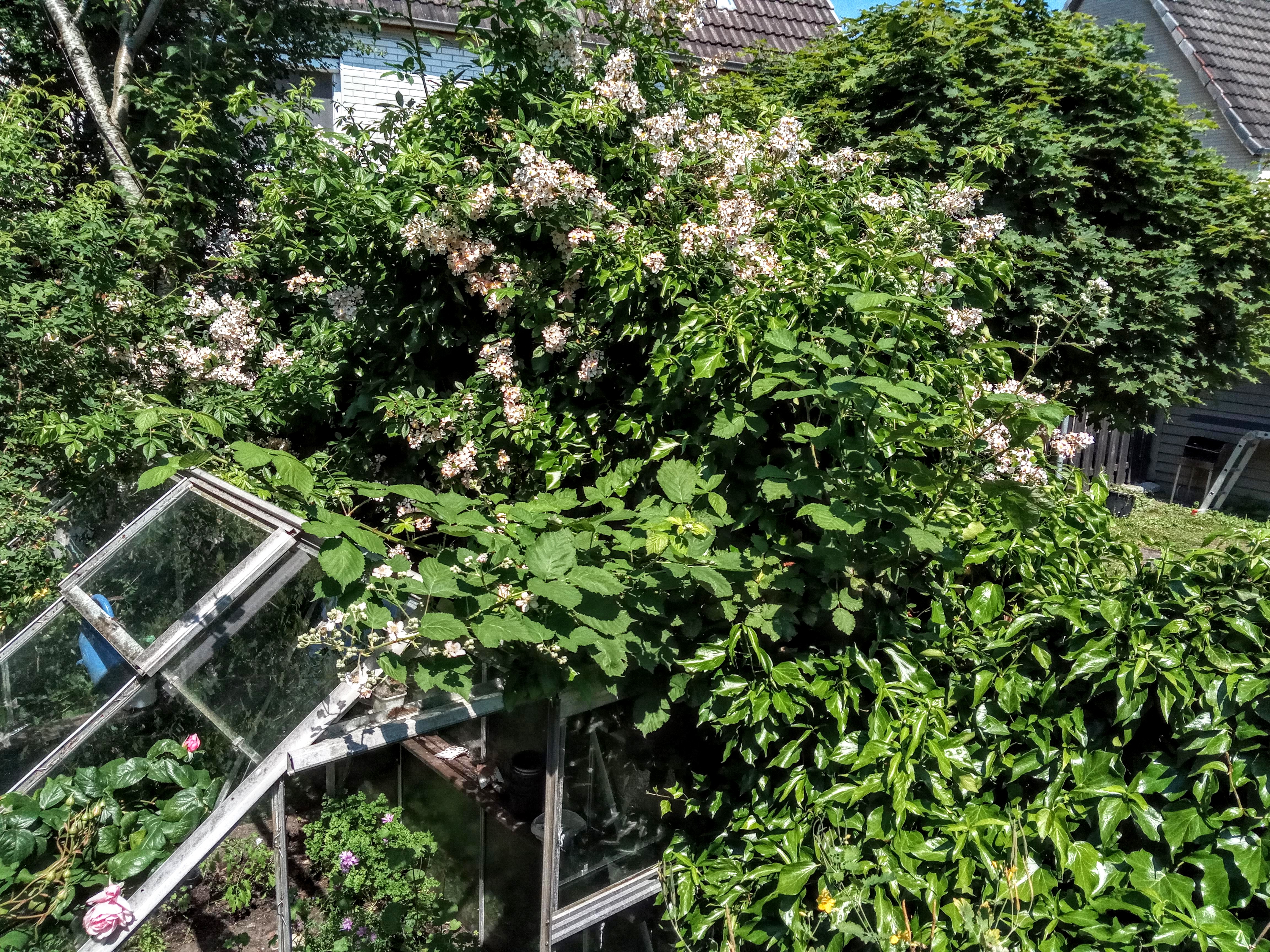 Die Reneclode, ein Apfelbaum, ein Flieder, alle die Nachbarpflanzen machen es schwierig sie als Ganzes abzulichten.