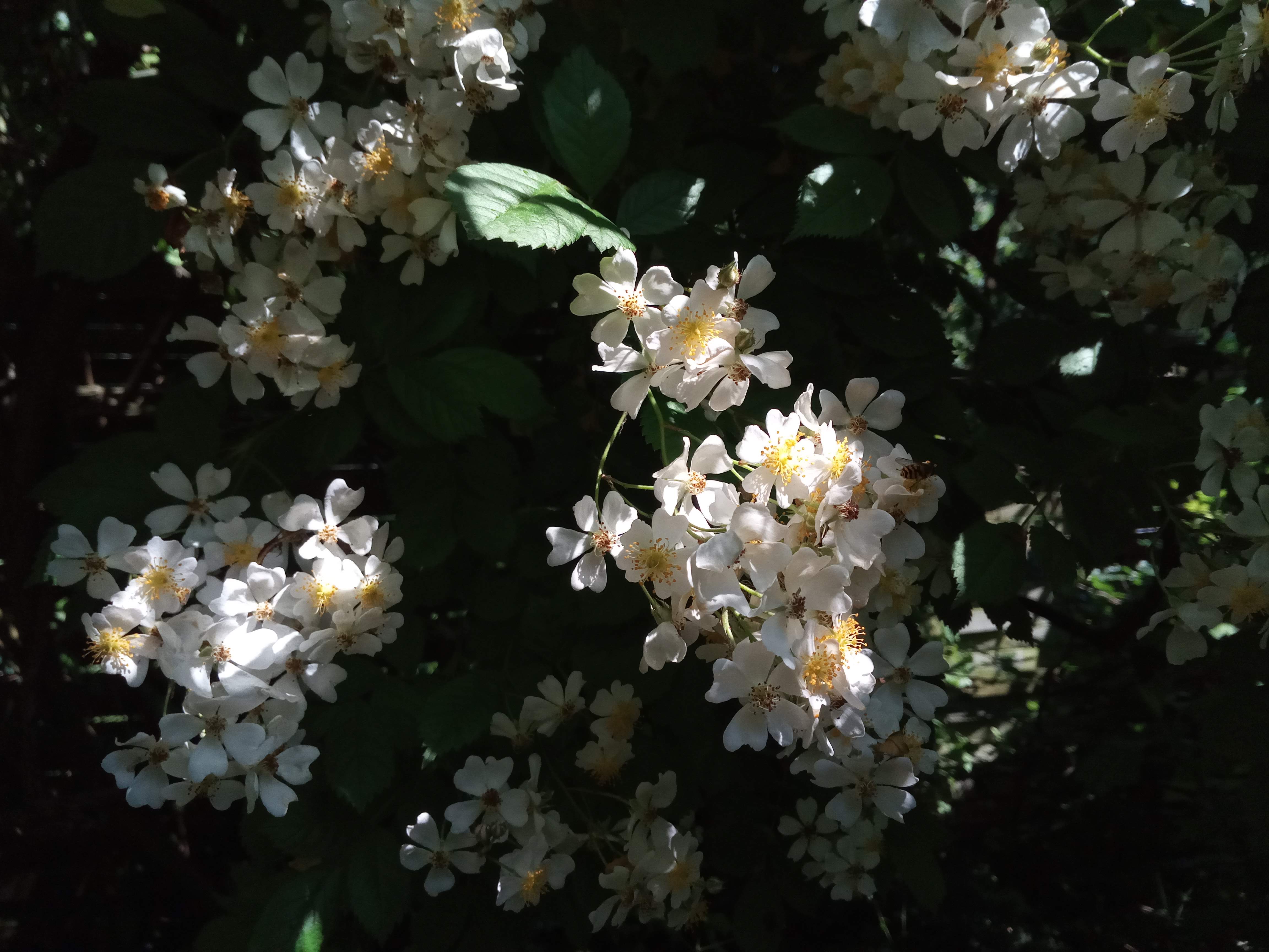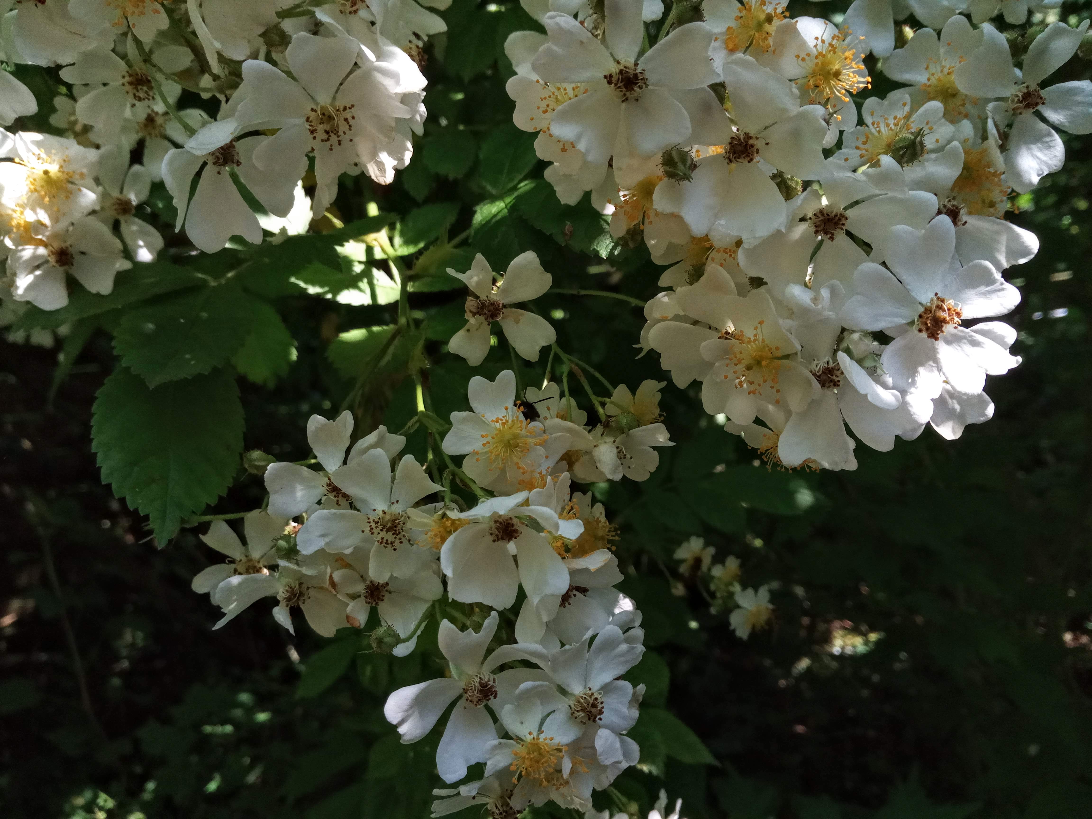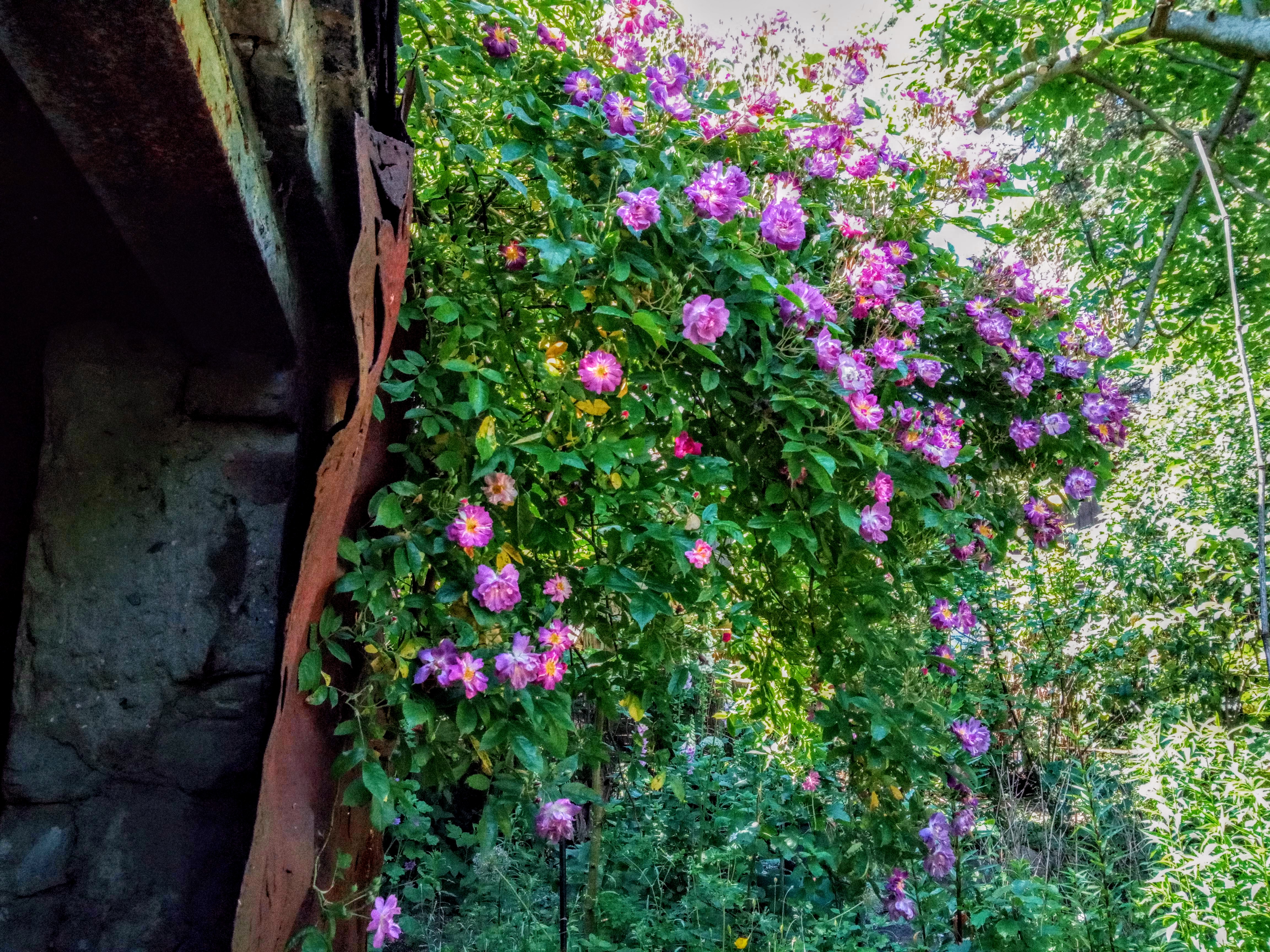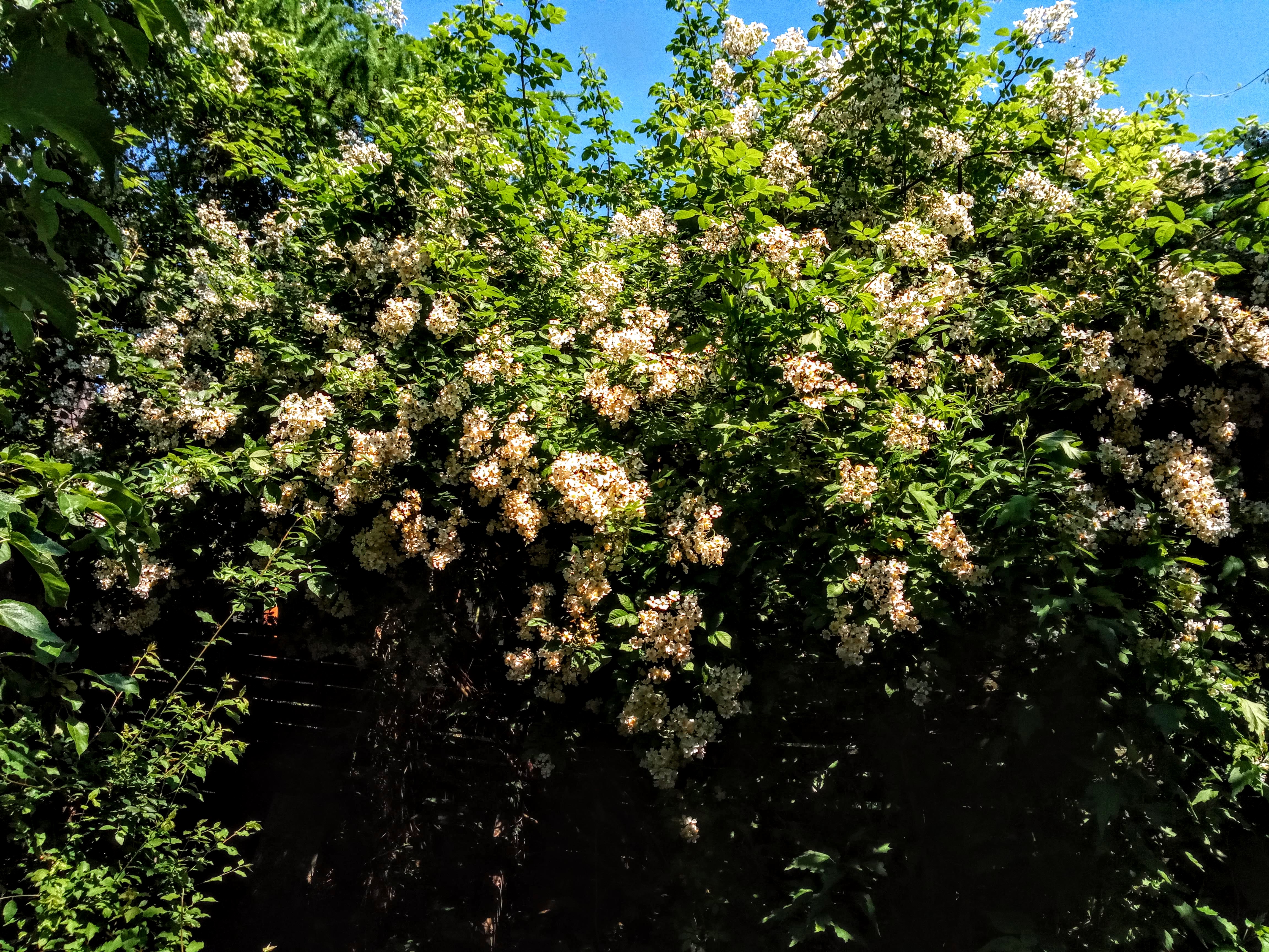 Sie stützt sich auf eine Lärche, ist auch ein Rambler und hat so dermassen viele Blüten.
