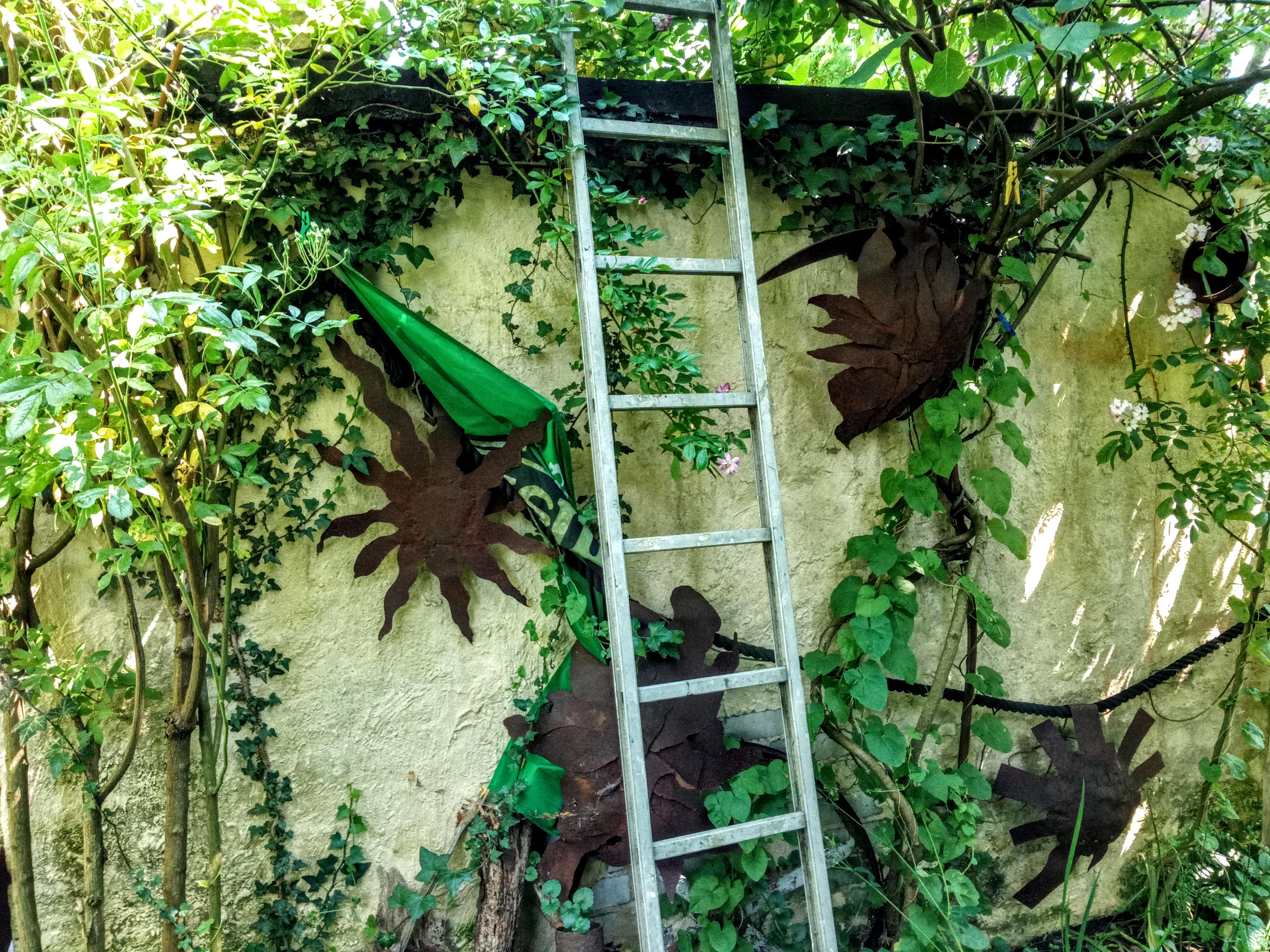 Ich kletter noch aufs Dach des Schuppens, um die zwei nächsten Riesen abzulichten, von dort aus kann man sie bei dem Urwald in unserem Garten am besten sehen.